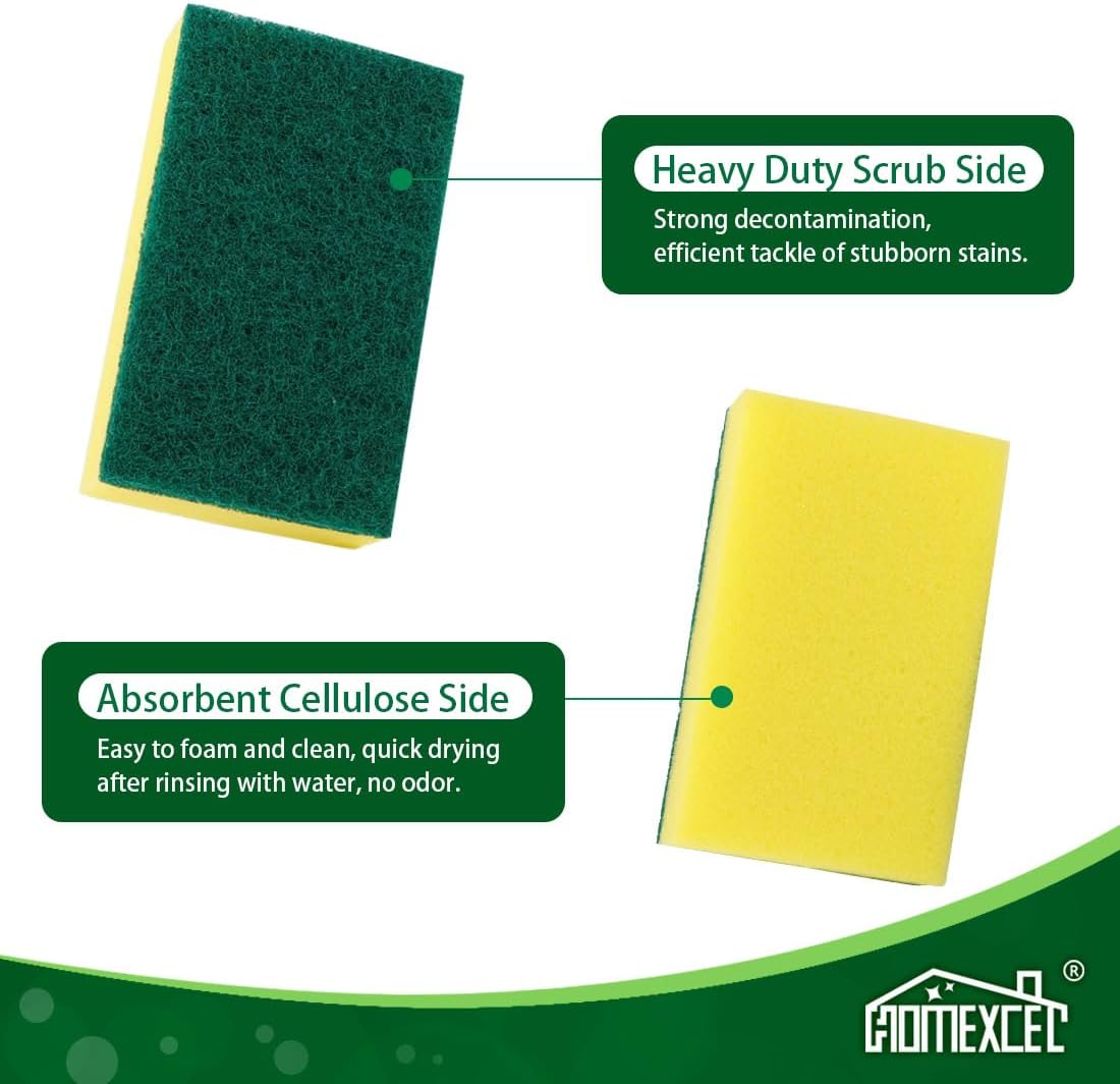 - Heavy Duty Sponges: The scrub sponges can remove grease and dirt from pot and pan; the yellow side of the absorbent sponge is gentle enough to clean glassware, while the green scrubbing side is strong enough to tackle the dirtiest tasks