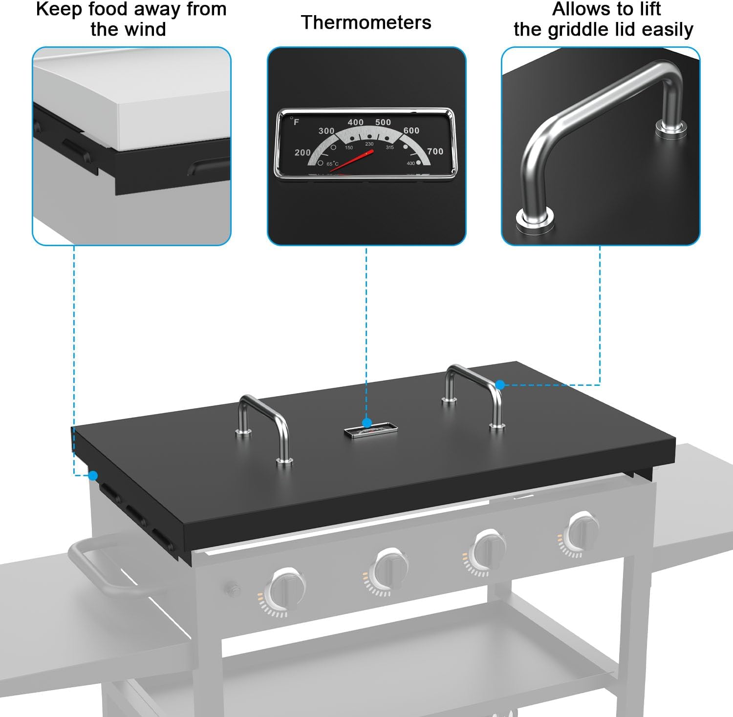 - 【Replace for Blackstone 5004 Hard Cover with Thermometer】Made of heavy-duty steel and coated with high-temperature resistant powder, our 36 inch Griddle Hood ensures durability and longevity. The hard lid also features a heat-resistant grip that is safe to touch. Thermometer to better check if the temperature inside the grill is at the temperature of the food being cooked.