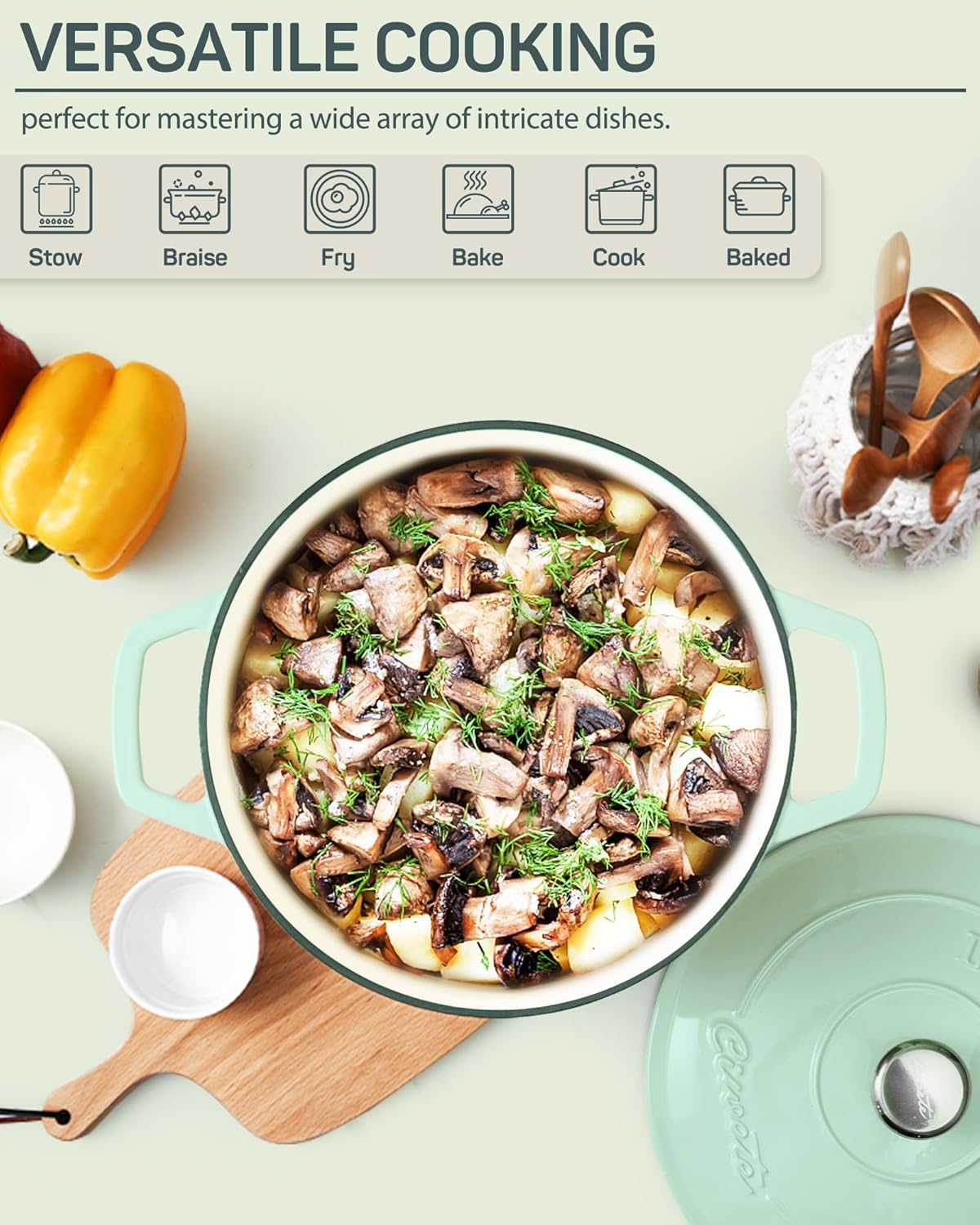 - Stylish & Functional Design: Combining practical functionality with elegant design, the cast iron dutch oven is a beautiful addition to any kitchen. Available in various colors and featuring an elegant shape, it enhances your cooking experience and adds a stylish touch to your kitchen decor
