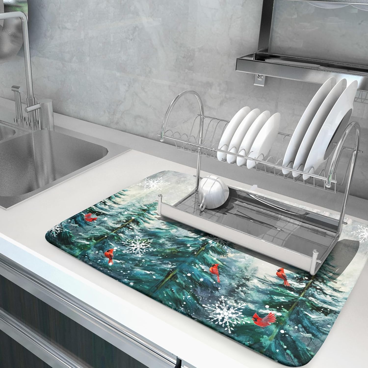 Pine Tree Dish Drying Mat for Kitchen Countertop Red Bird Dishes Mats Winter Decorative Absorbent Reversible Drainer Rack Pad 18x24 Inch