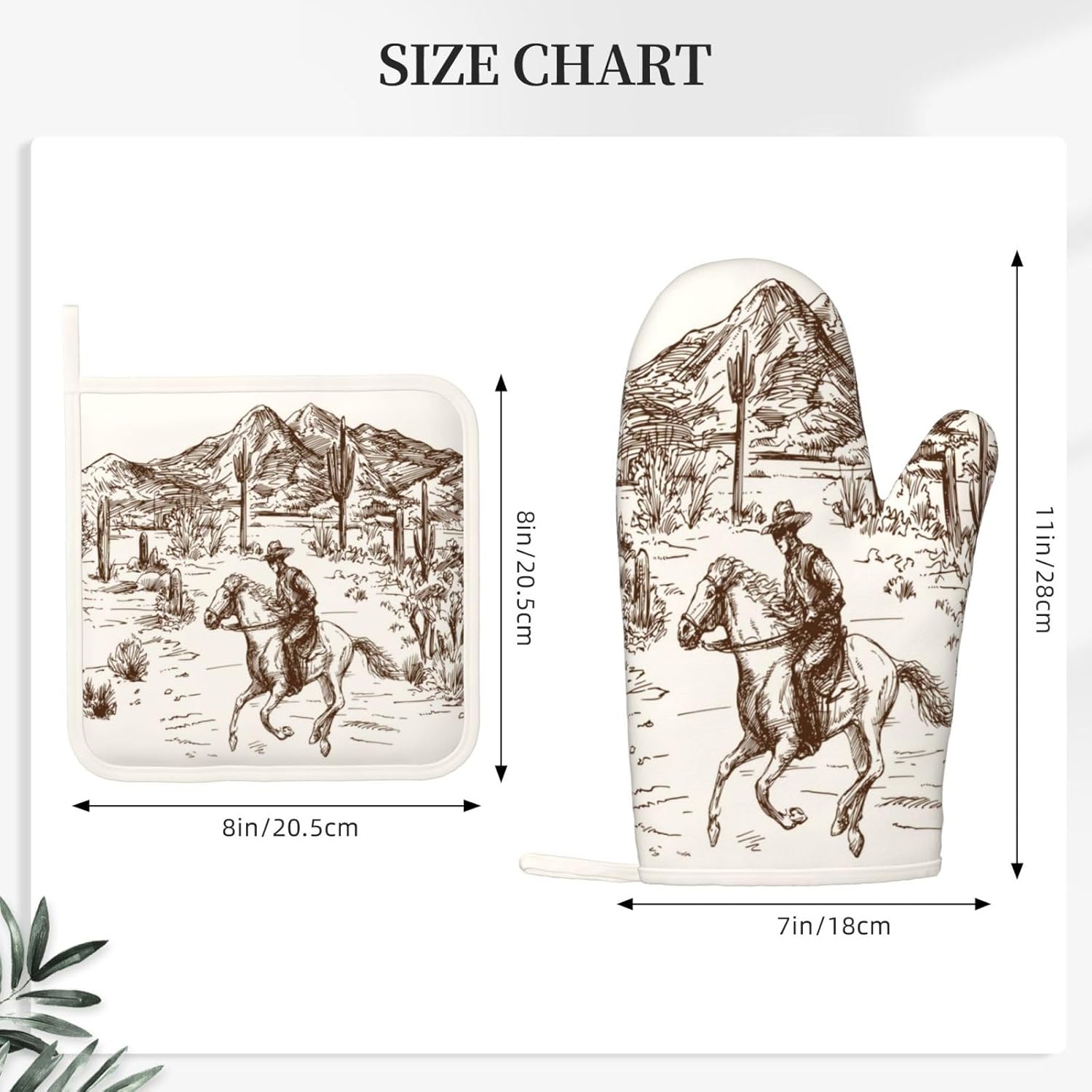 - MATERIA: These western cowboy oven mitts and pot holders made of polyester material, the surface with silicone and the lining is filled with soft cotton, which is comfortable to the touch, flexible to hold, making it a great choice for use in kitchen ovens or hot soup pots.