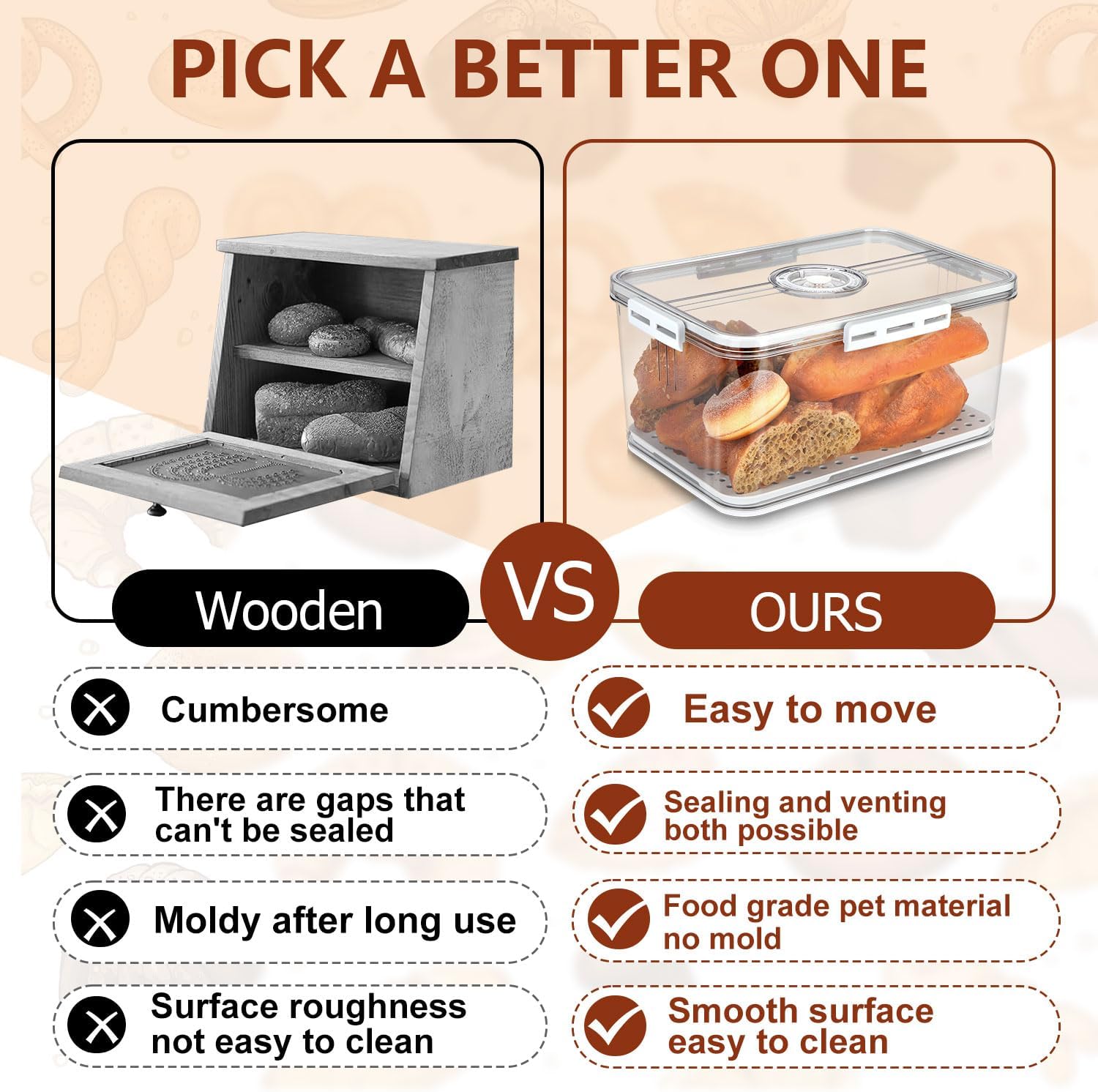 - Why choose our bread box: Compared with the long strip shape bread container,our bread storage box is wide and suitable for putting different shapes of bread.Compared to the wooden breadbox,our bread storage container is easy to clean and the material of the bread keeper box will not get moldy after years.Our bread bin is sealed for resistant to moisture.Have an air valve on the bread box lid,optionally release hot bread airflow or seal against moisture