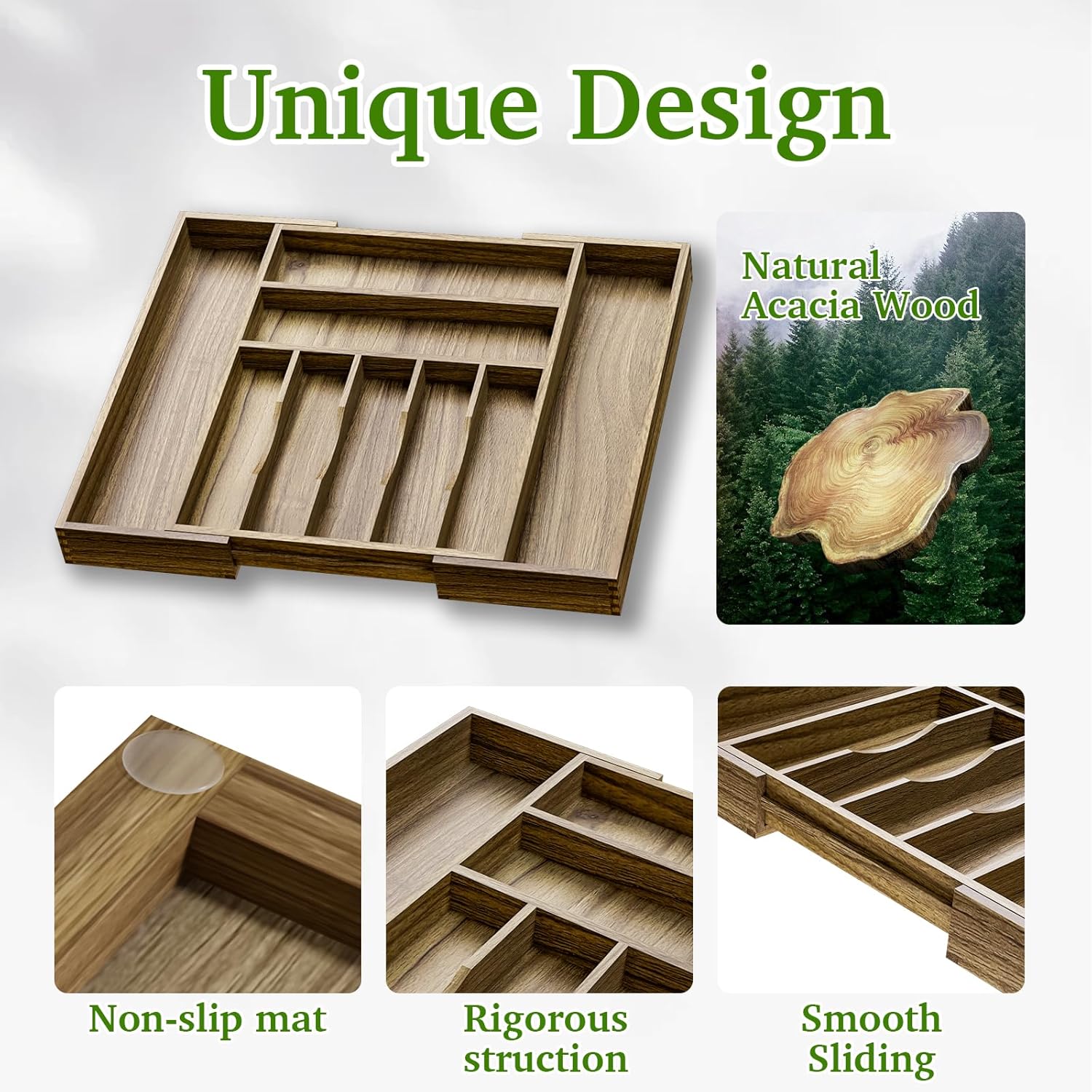 - šššš®š«šš„ ššššš¢š ššØšØš-Made of acacia wood, this silverware drawer organizer is very attractive, well made and easy to clean. More resistant than plastic and other materials. The color of natural wood is so beautiful and rich.