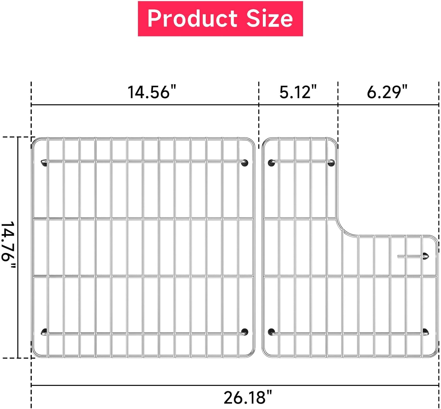 - Dimensions: Left Rack Dimensions: 14.56" x 14.76", right Rack Dimensions: 11.62" x 14.76". Overall size: 26.18"x14.76"(inclueds Left and Right Racks) Note: Please confirm that our sink protector fits your sink before placing an order