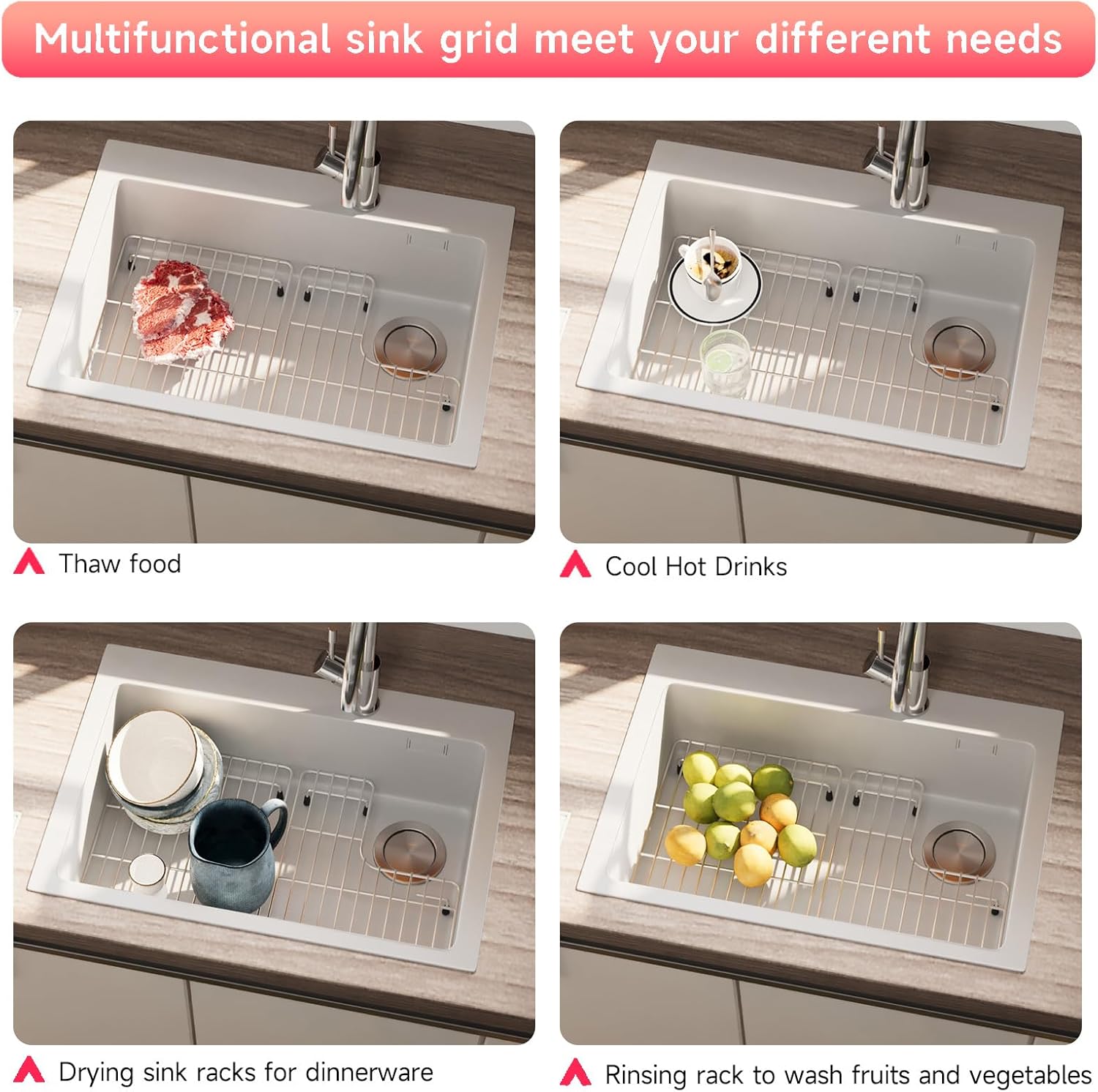 - Function: The kitchen sink grid can be applied in a variety of applications; It can be applied not only as a kitchen sink grate but also as a cooling rack, dishware drainer, food prep/rinse rack, etc.; You can rinse and drain all the veggies and fruits on these racks; Add to your cart now, and then you will have a nice metal sink protector for your kitchen