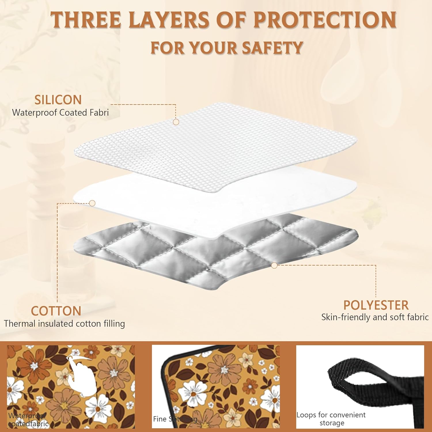 2 Pack Vintage Floral Pot Holders for Kitchen Heat Resistant, White Brown Flowers Potholders for Kitchens Washable for Cooking & Baking & Microwave