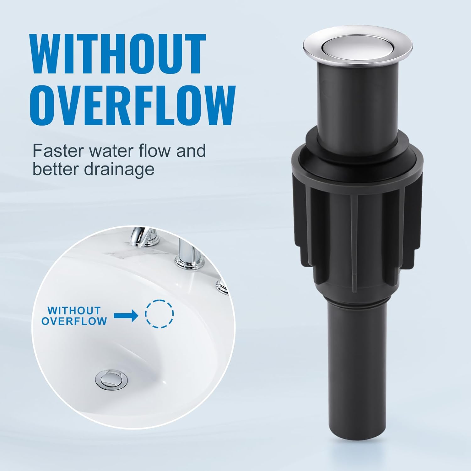 - 【Without Overflow】- This pop up drain stopper assembly works with vessel, basin, and above Counter bathroom sinks without Overflow and allows for faster drainage.