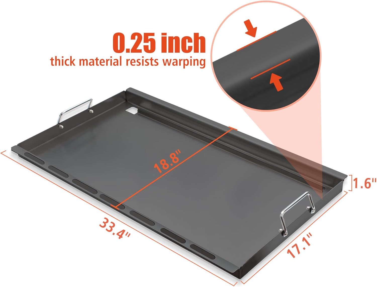 - Perfectly Fit & Precision Design: This heavy-duty flat top griddle measures 33.4"L x 18.8"W x 1.6"H (0.25" thickness) with a 33.4" x 17.2" cooking surface. Designed as a direct replacement for Weber 6789, 66097, and 66089 models, it fits Genesis II 400 series gas grills (2016+) including E-410, S-410, SE-410, E-435, S-435, LX S-440, and E-440. Verify your grill’s dimensions and shape prior to purchase for optimal fitment.