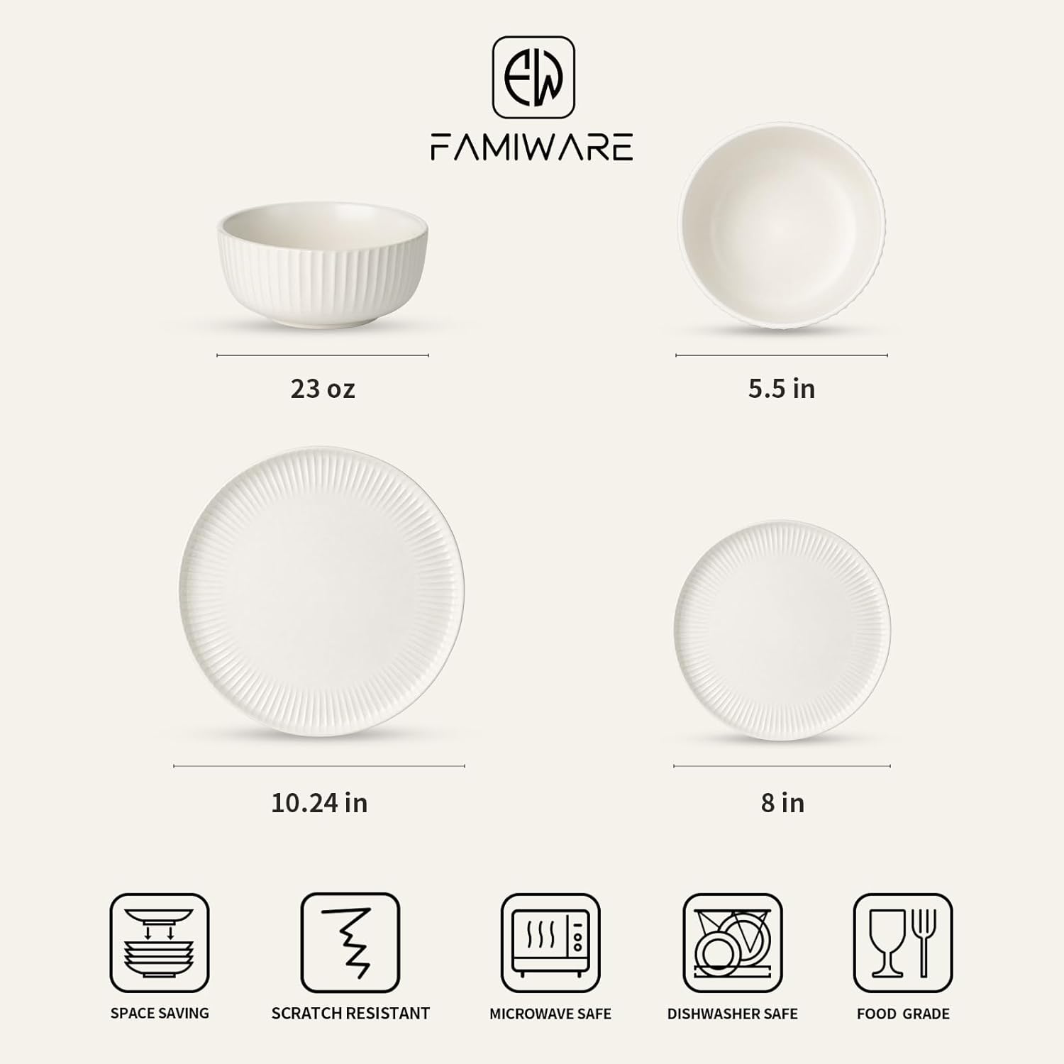 Famiware Starlight Dinnerware Sets, Plates and Bowls Dish Set of 8 (24 Pieces), Ribbed Textured Tableware - Dishwasher & Microwave Safe, Chip Resistant, Reactive Glaze, Matte Reactive White