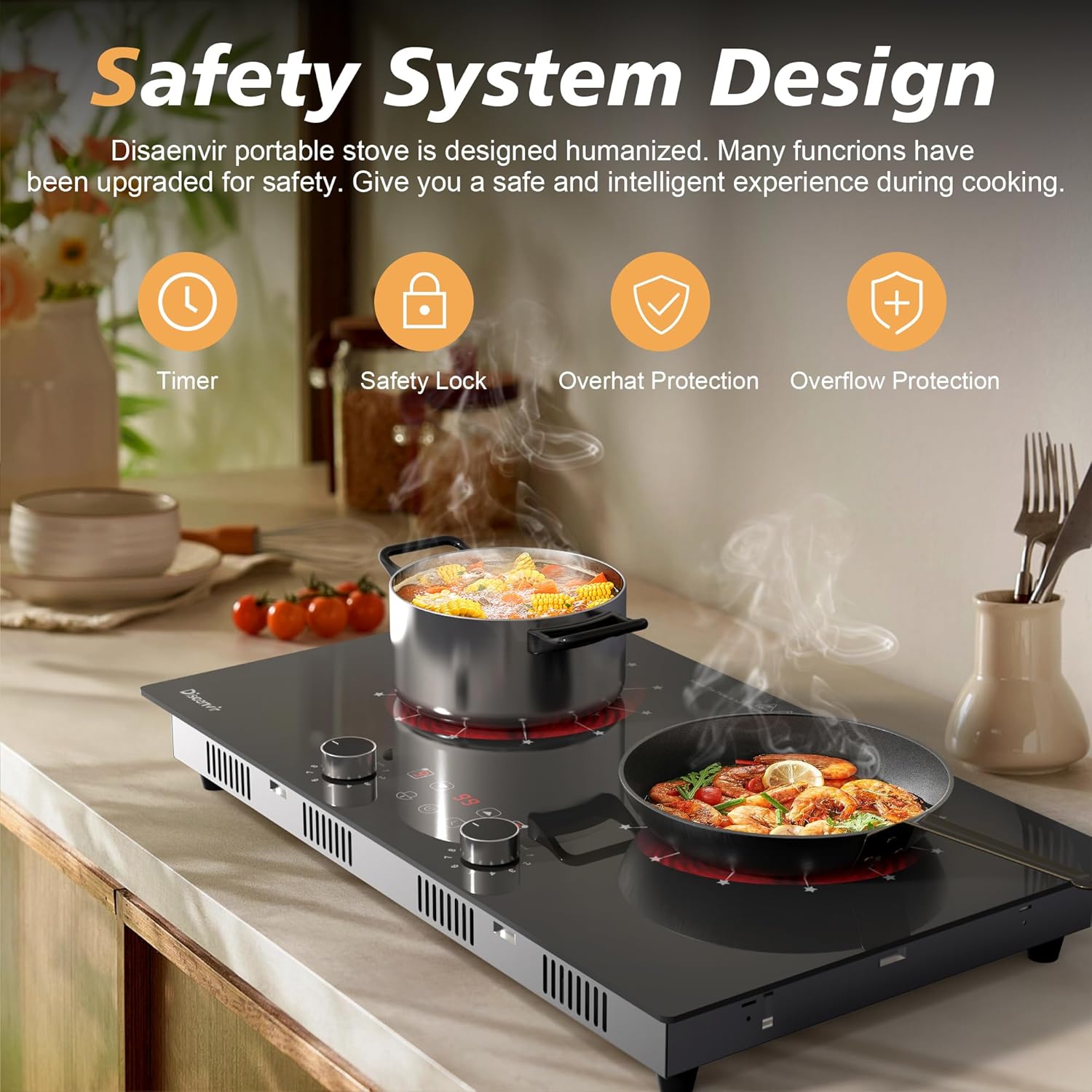 - đ¨ăMulti-functional Electric CookopăDisaenvir plug in cooktop is equipped with a range of advanced features that enhance both convenience and safety. It includes a built-in timer function that allows users to set specific cooking durations. A child lock feature prevents accidental adjustments of the controls by kids or pets. Additionally, it has an overheat indicator that alerts users when the temperature exceeds safe levels, helping to prevent potential burns or fire hazards.