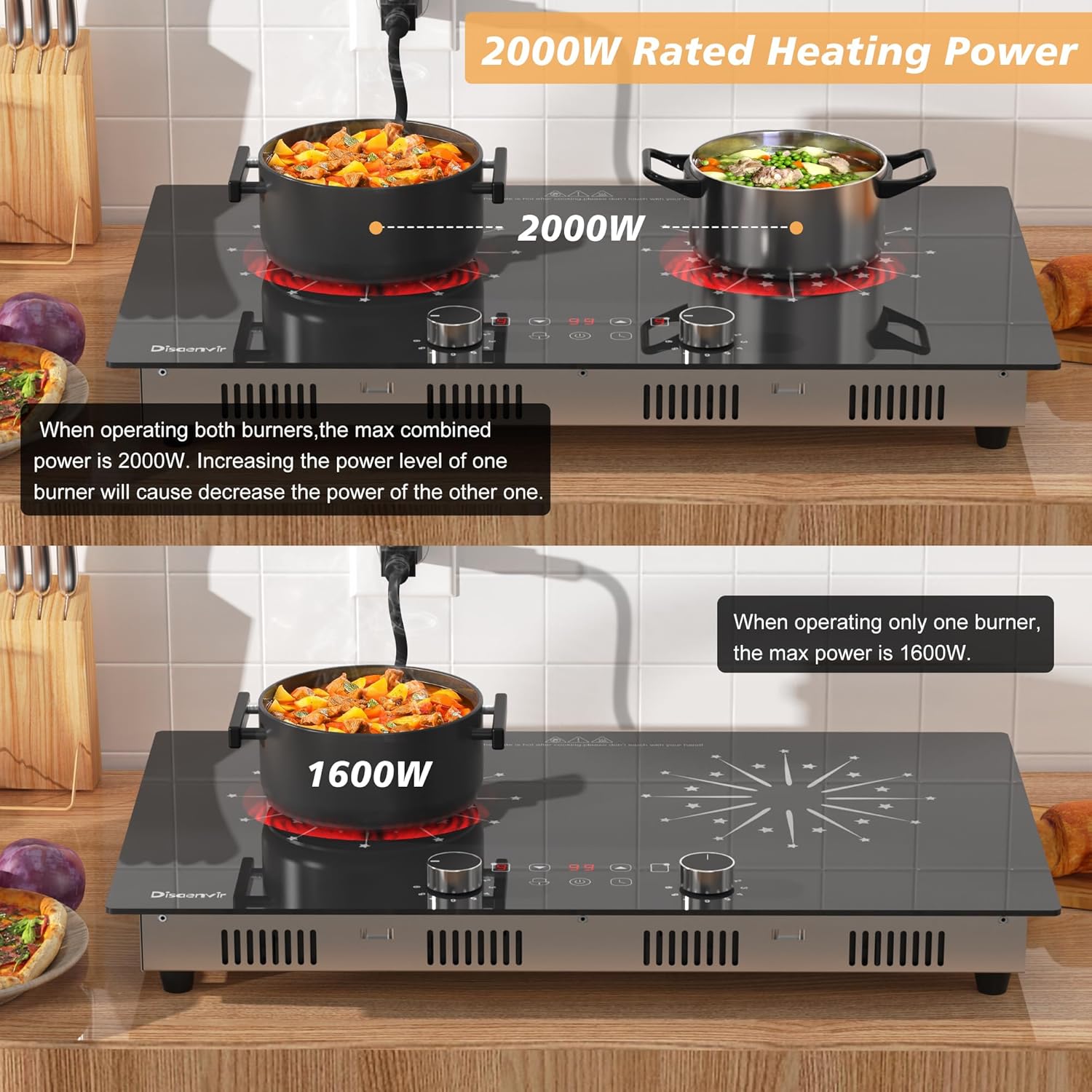 - â¨ă2 Indpendent High Power Heating ZonesăUsing a 110-120V / 1600W(left plate) + 1600W(ring plate) power supply, Disaenvir portable electric stovetop has two separate cooking zones. When operating both burners, the max combined power is 2000W. Increasing the power level of one burner will decrease the other one's. If you only use one burner, the max heating power is 1600W, so this stove is capable of reaching high temperatures for efficient cooking from simmering to frying.