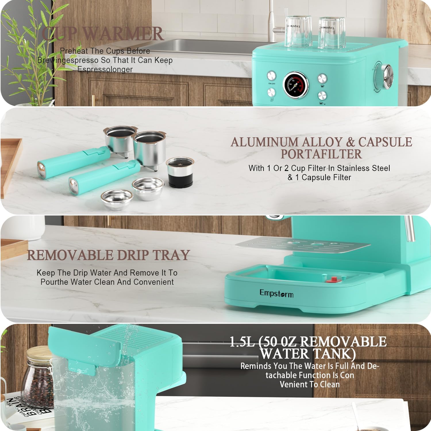 - 💧𝟏 & 𝟐 𝐂𝐮𝐩 𝐅𝐮𝐧𝐜𝐭𝐢𝐨𝐧 :The Empstorm barista coffee machine is designed with versatility in mind, featuring two distinct filters tailored for single or double espresso shots. Depending on your preference, simply select the corresponding button for a one or two-cup serving on the control panel, and the machine will automatically brew the perfect espresso