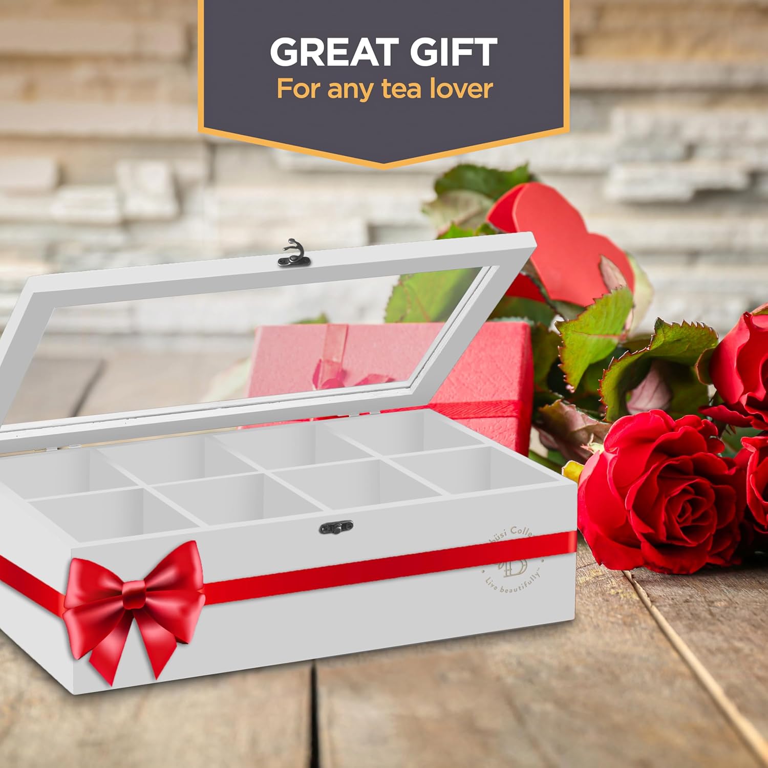 Bambüsi Tea Bag Organizer - Bamboo Tea Box Organizer Storage Box, Tea Bag Holder with Acrylic Window, Magnetic Lid Keeps Tea Bags Fresh - Tea Organizer Caddy (Tea Not Included) Christmas Gift - White