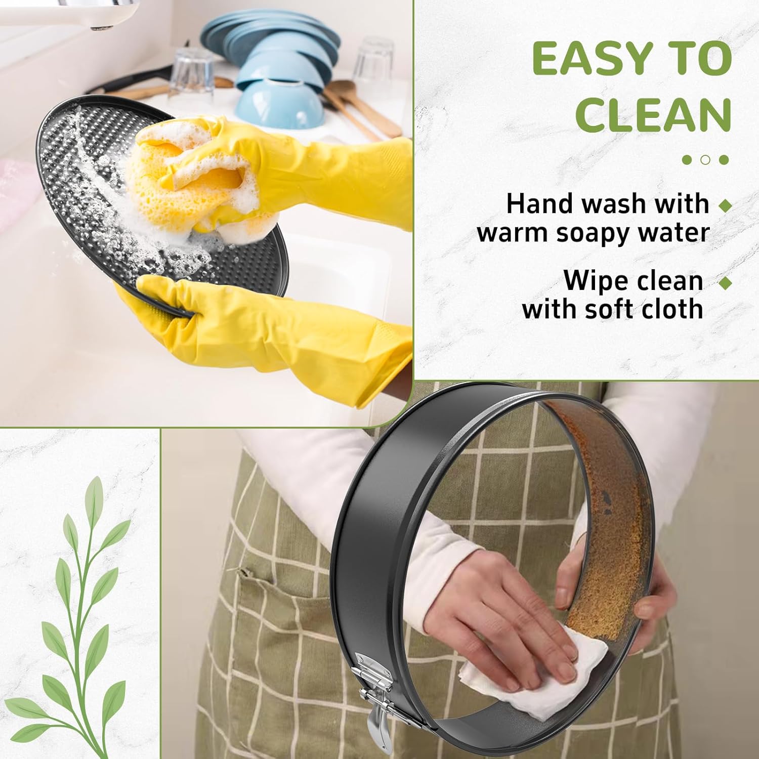 - Easy to Clean: The premium non-stick coating can reduce the absorption of grease in the pan while making cleaning a breeze. To protect the non-stick coating, hand wash only is recommended when cleaning the round spring form cake pans