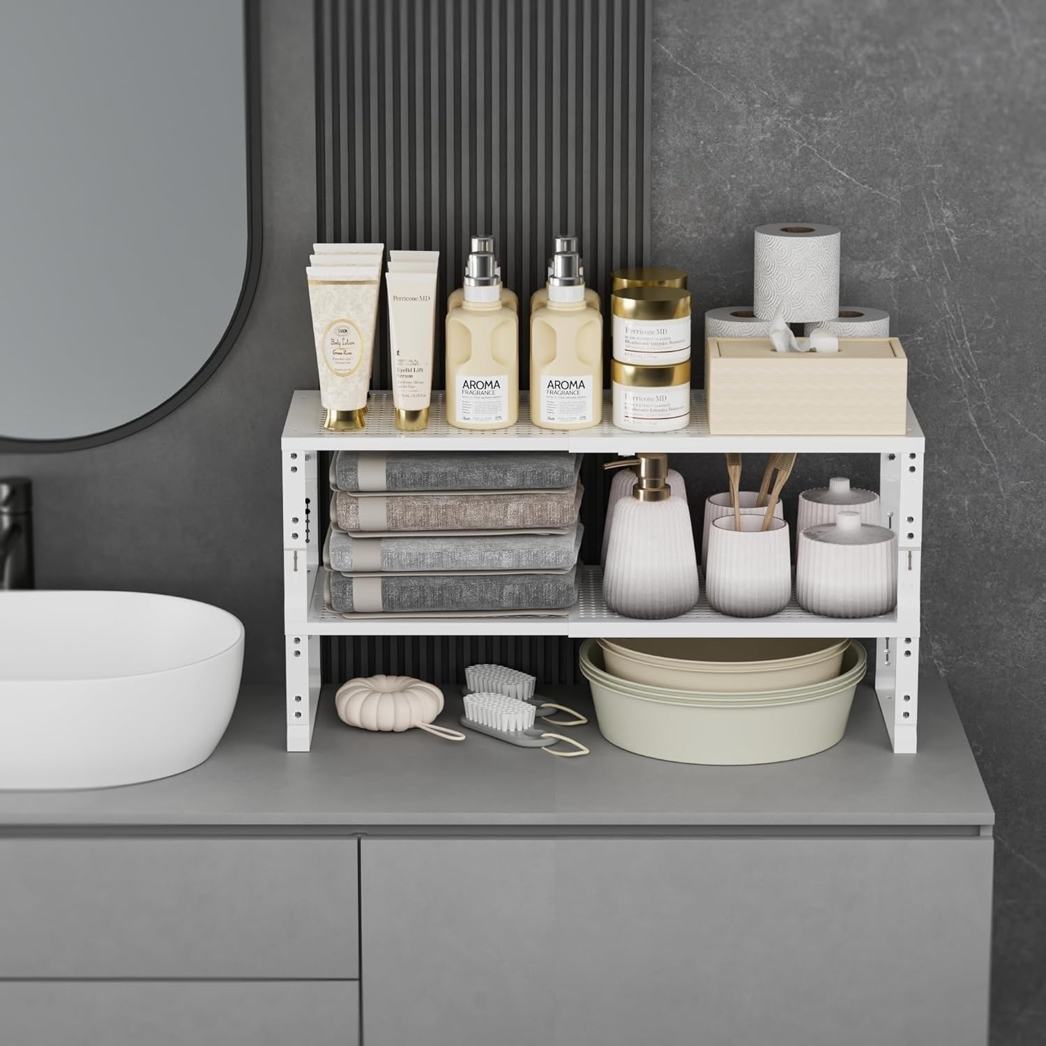 - âăExpandable,StackableăThe shelves can easily expand and contract according to your storage needs, whether it is kitchen clutter or office supplies.You can combine multiple shelves together to form a large storage system, or separate them into several separate smaller units(MeasureïŒ10.24"D x 16.54"W~27.17"W x 8.31"H/7.68"H/7.05"H/6.42"H)