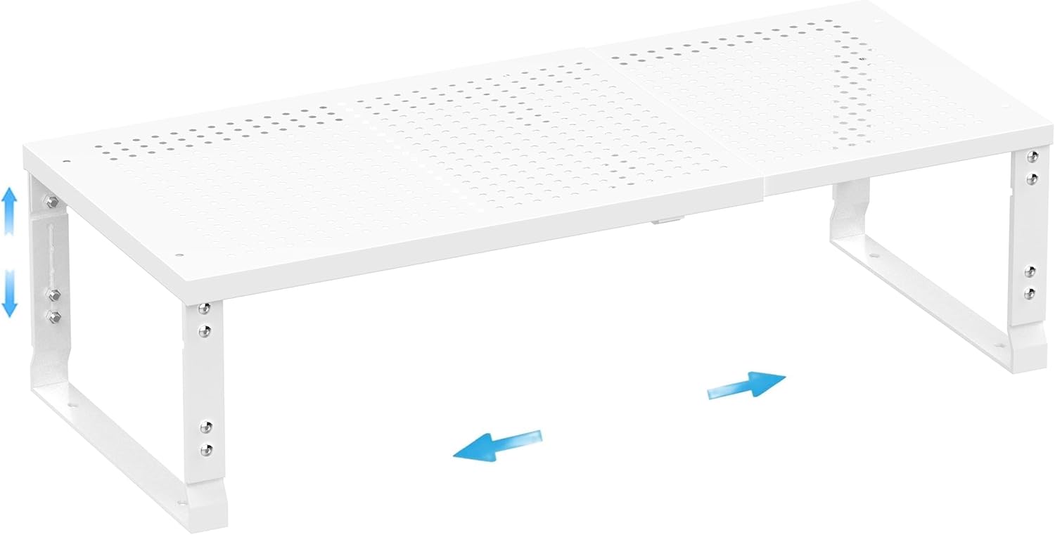 - âăExpandable,StackableăThe shelves can easily expand and contract according to your storage needs, whether it is kitchen clutter or office supplies.You can combine multiple shelves together to form a large storage system, or separate them into several separate smaller units(MeasureïŒ8.11"D x 16.54"W~27.17"W x 8.31"H/7.68"H/7.05"H/6.42"H)