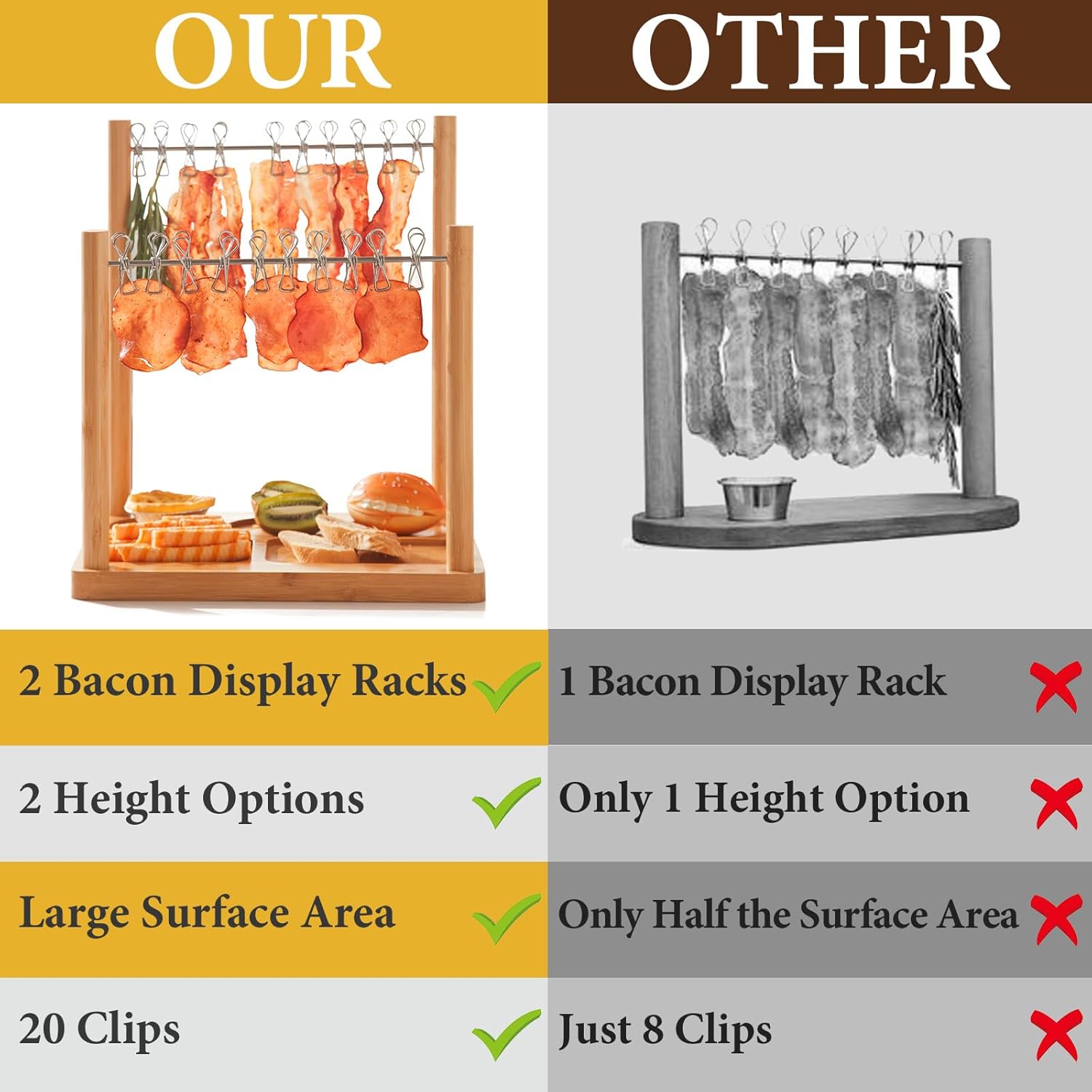 Bacon Display Rack with Clothesline Serving Tray, Patented Design Bacon Serving Dishes and Extra Double Hangers, Exquisite Holder for Housewarming, Home Party, or Wedding Gifts (Natural Bamboo)