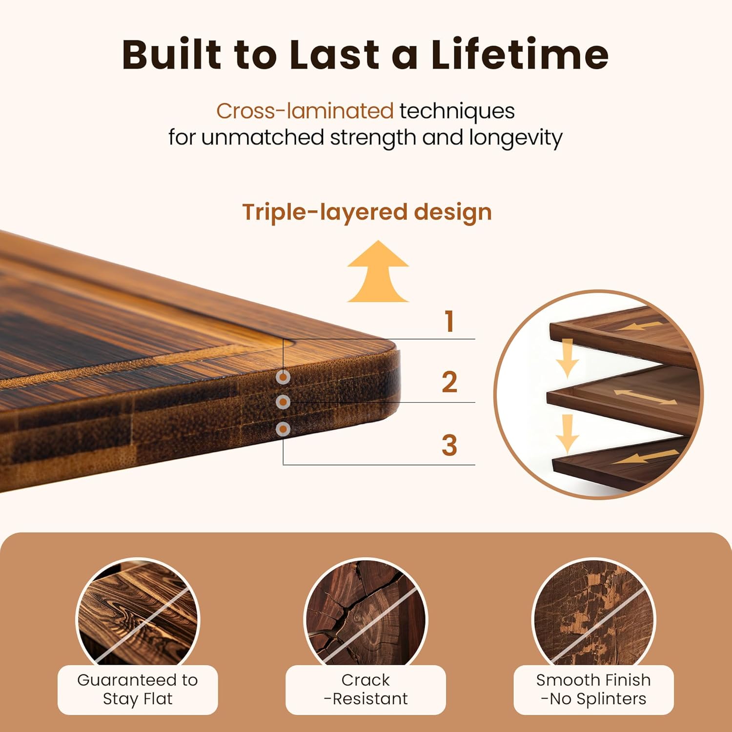 - 【DEEP JUICE GROOVES】:Built-in deep juice grooves to capture excess liquid during food prep. No need to worry about meat, fruit, or vegetable juice running off the board and onto your countertop when cutting. Thus you can keep your work area beautiful even during the busiest cooking time.