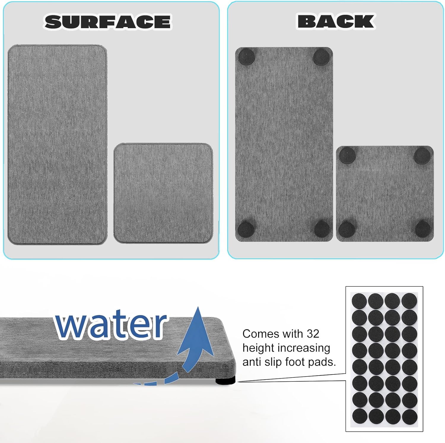 - More Anti Slip and Ventilated --- The silicone footpads boost the slip-resistance of stone drying tray while keeping them out of the bathroom vanity.This design improves the contact surface between fast drying stone sink tray and air, accelerates the evaporation of water,and extends the service life of the water absorbing stone.
