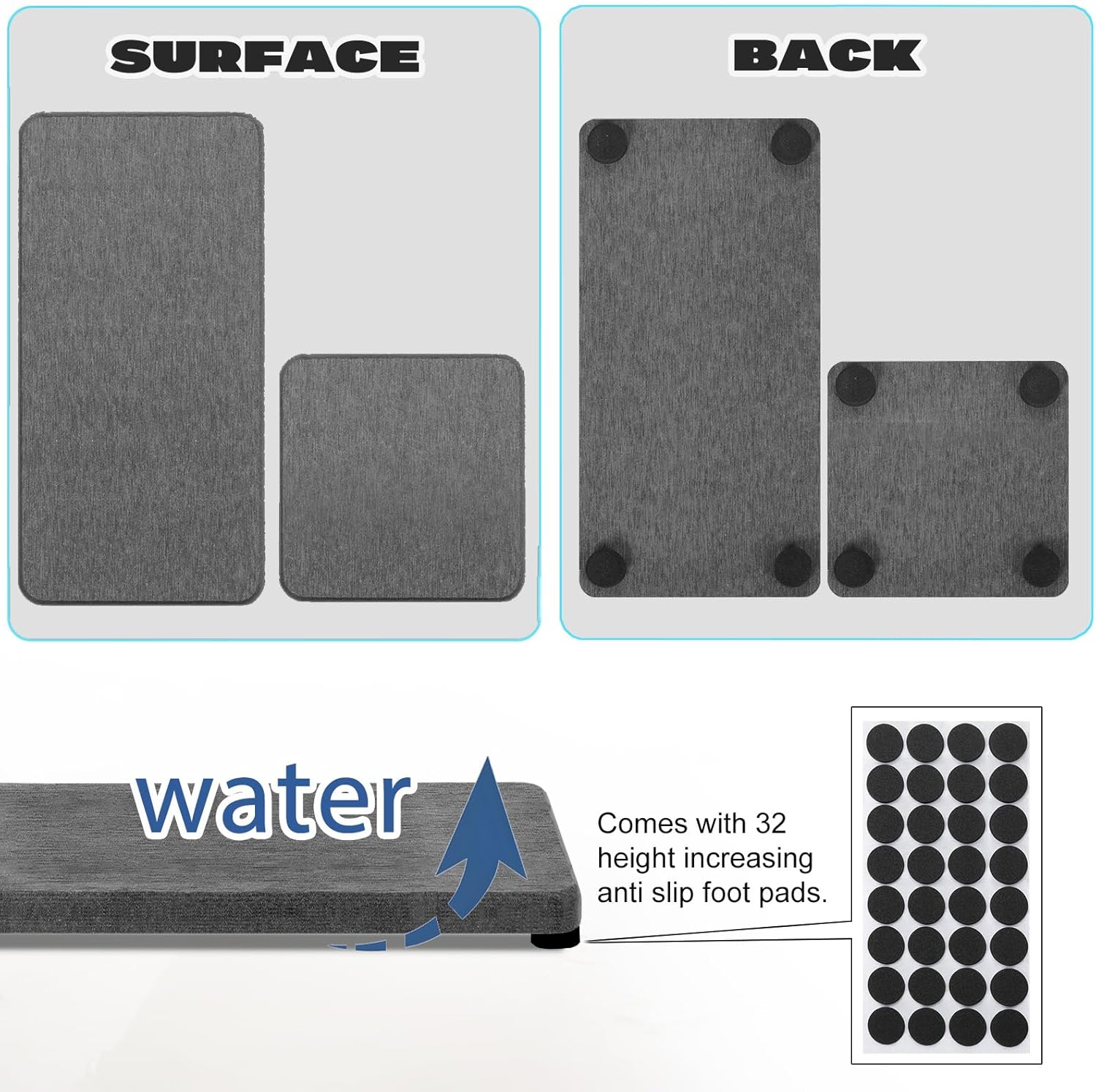 - More Anti Slip and Ventilated --- The silicone footpads boost the slip-resistance of stone drying tray while keeping them out of the bathroom vanity.This design improves the contact surface between fast drying stone sink tray and air, accelerates the evaporation of water,and extends the service life of the water absorbing stone.