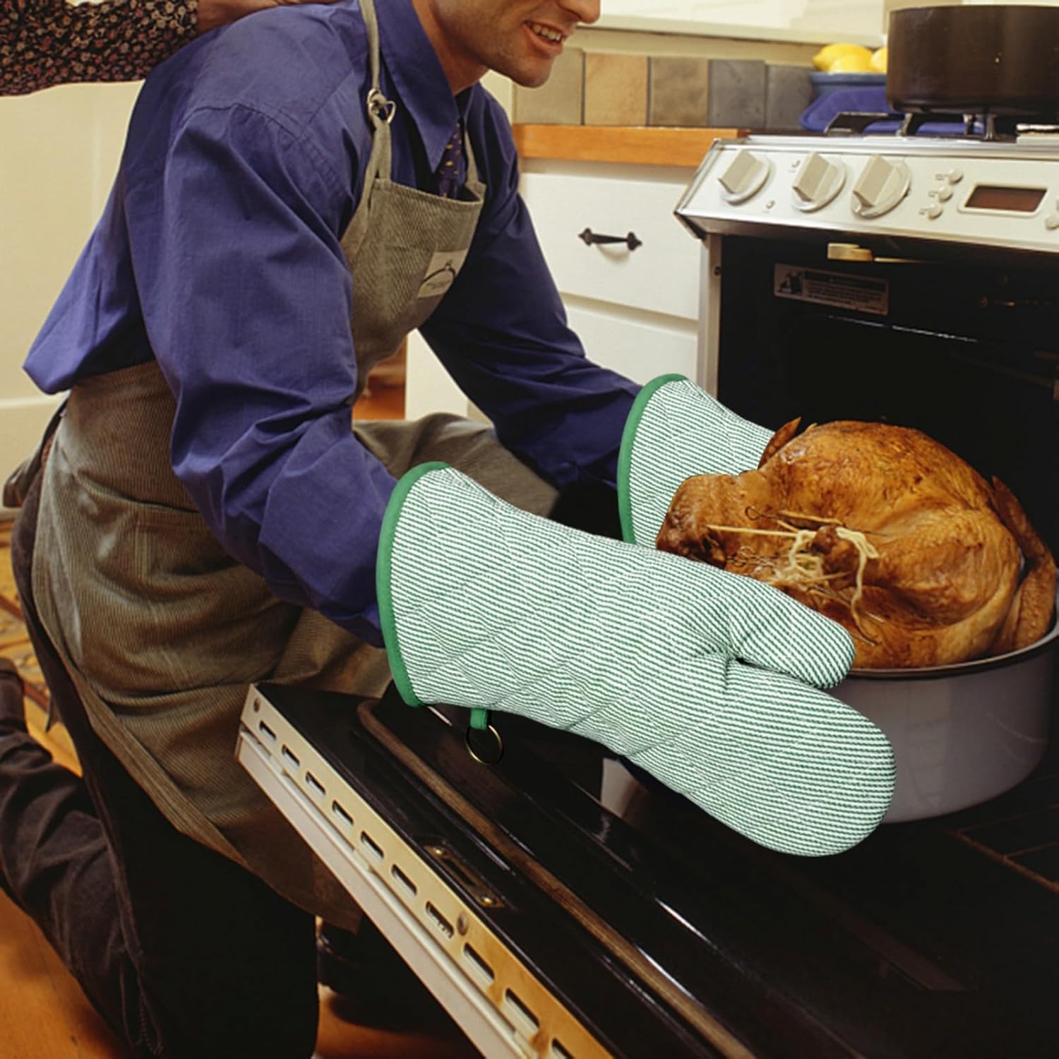 1 Pair Yarn Dyed Oven Mitts 100% Cotton Heat Resistant 470 Degree Gloves Men Women Cooking Baking Barbecue BBQ Microwave Crafting Machine Washable Pot Holders Mittens (Green)