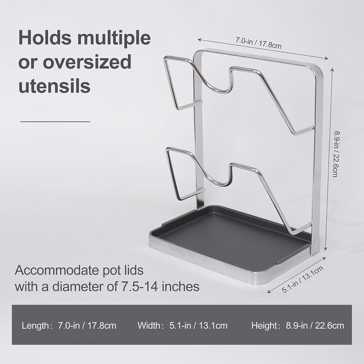 - 【Space Saver & Versatility】Our pot lid stand is designed to accommodate most pot lids, fitting diameters from 7.5 to 14 inches. It is space saving for place 2 lids vertically without taking up much space, making this pan lid holder a practical addition to any kitchen