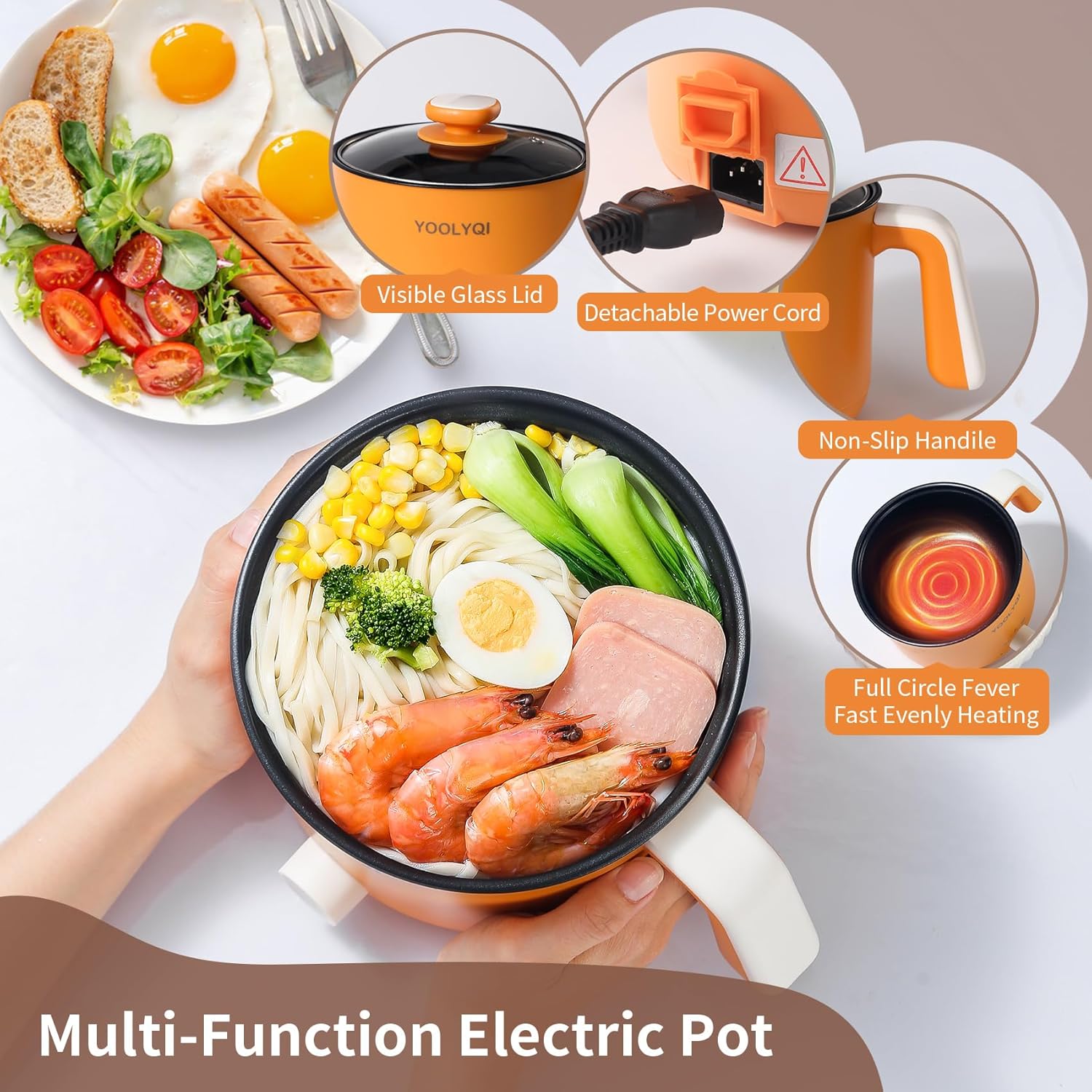 - Quick Multifunctional Cooker: The electric pot has 2 simple cooking modes to make your cooking dreams come true.The temperature can be adjusted according to your cooking needs, and with 300W and 600W power, you can simmer soups, cook spaghetti, pasta, soups, porridge, eggs, oatmeal and other delicious foods.YOOLYQI rapid ramen cooker makes preparing dinner quick, easy and convenient.