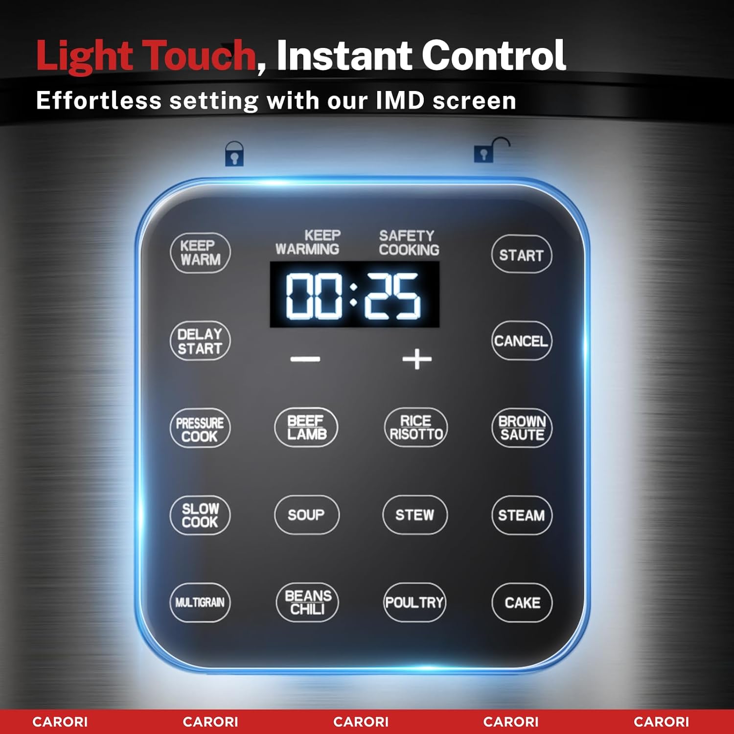 - IMD Touchscreen: Featuring a high-definition IMD touchscreen delivers a stunning touch experience, this pressure cooker offers easy, fingertip control. No more struggling with hard-to-press buttons—just a light touch to select from 12 versatile cooking programs for perfect meats, vegetables, beans, rice, poultry, cakes, and more.