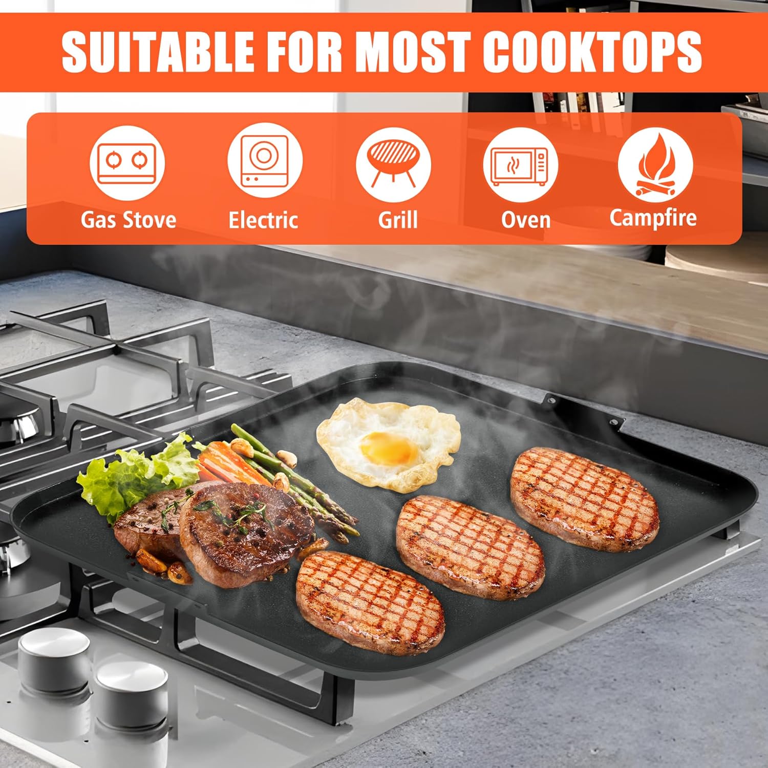 • EXCELLENT NON-STICK PERFORMANCE: The stove top griddle is coated with food-grade non-stick coating and is PFOA, BPA and PTFE free. It ensures food comes out of the pan effortlessly and makes cleaning a breeze, so say goodbye to sticking