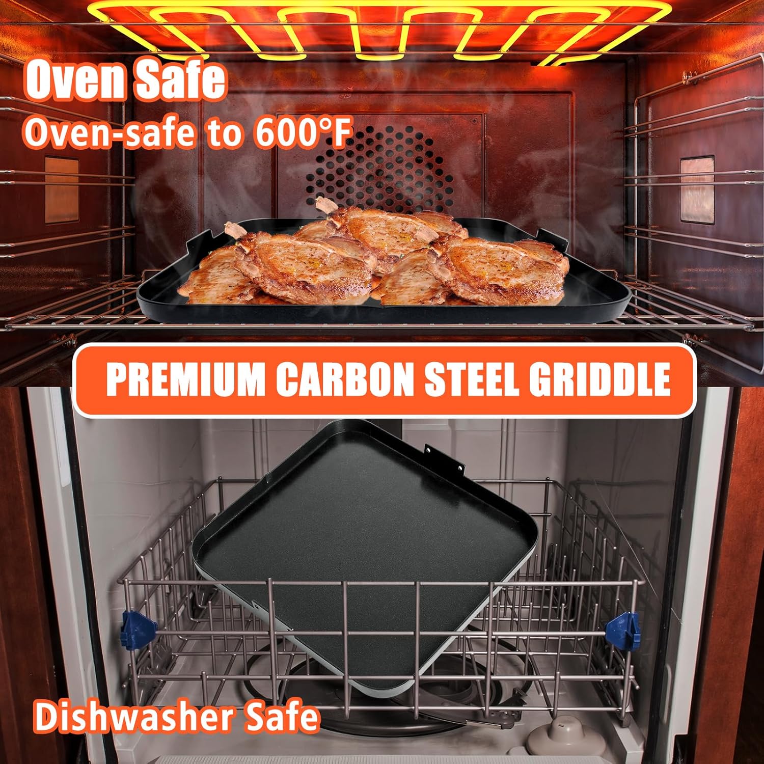 • STURDY AND DURABLE: This griddle pan is made of durable heavy-duty carbon steel, high temperature, rust and corrosion resistant, sturdy and durable, providing you with your favorite outdoor grilling flavors and unmatched heat retention, even heat distribution and fast heat conduction for outstanding cooking results