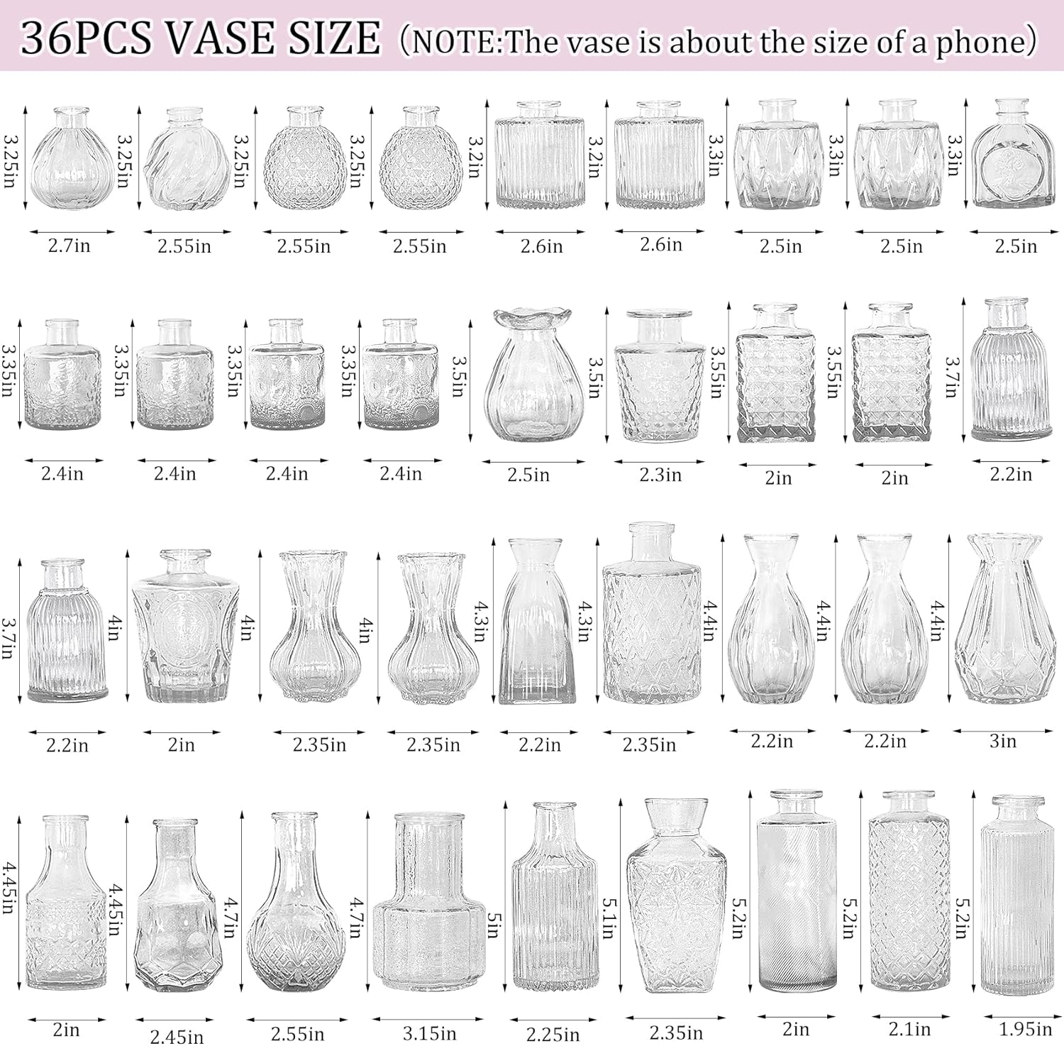 - ❤Wide Range Of Uses: The clear glass bud vase set would be the perfect affordable option for a wedding table, tea party, office or home decoration, and other special occasions. The set contains 36 bud vases. These cute vintage glass vases can perfectly enhance the appearance of any tables.