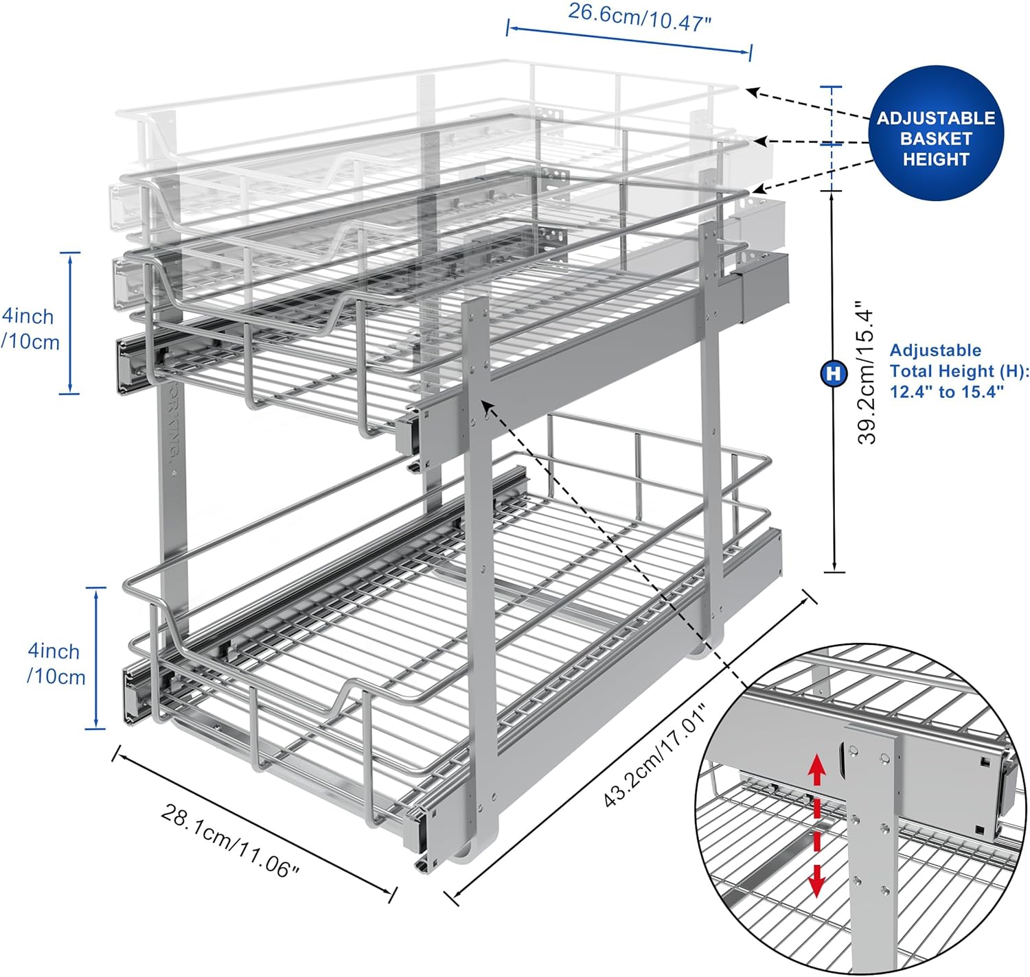 2 Tier Pull Out Cabinet Organizer 11" W X 17" D, Slide Out Drawers for Kitchen Cabinets, Pull Out Drawers for Cabinets Capacity Heavy Duty Caddy, Cabinet Pullout Shelves Chrome-Plated,Bathroom Pantry