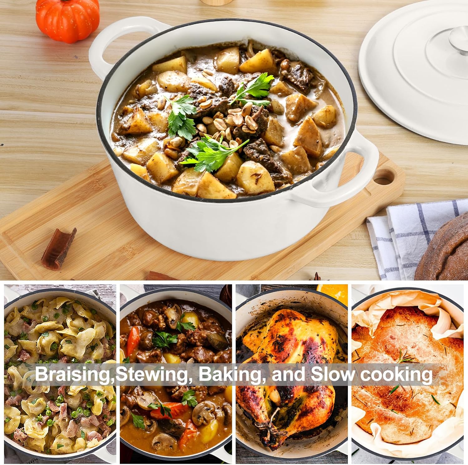 E-far 6 Quart Dutch Oven, Enameled Cast Iron Dutch Oven Pot with Lid, Nonstick Round Cookware for Braising/Stews/Roasting/Bread Baking/Cooking, Heavy Duty, Induction & Oven Safe - White