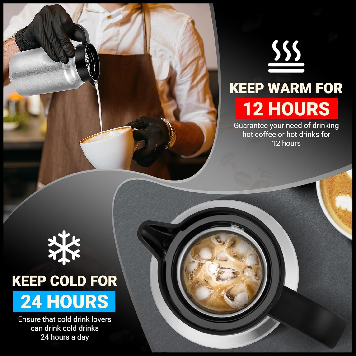 - Double-wall Vacuum Insulation: Perfect for hot water,hot cocoa, milk, or coffee, this double-wall vacuum insulated coffee carafe features advanced insulation to keep your drinks at the ideal temperature for hours