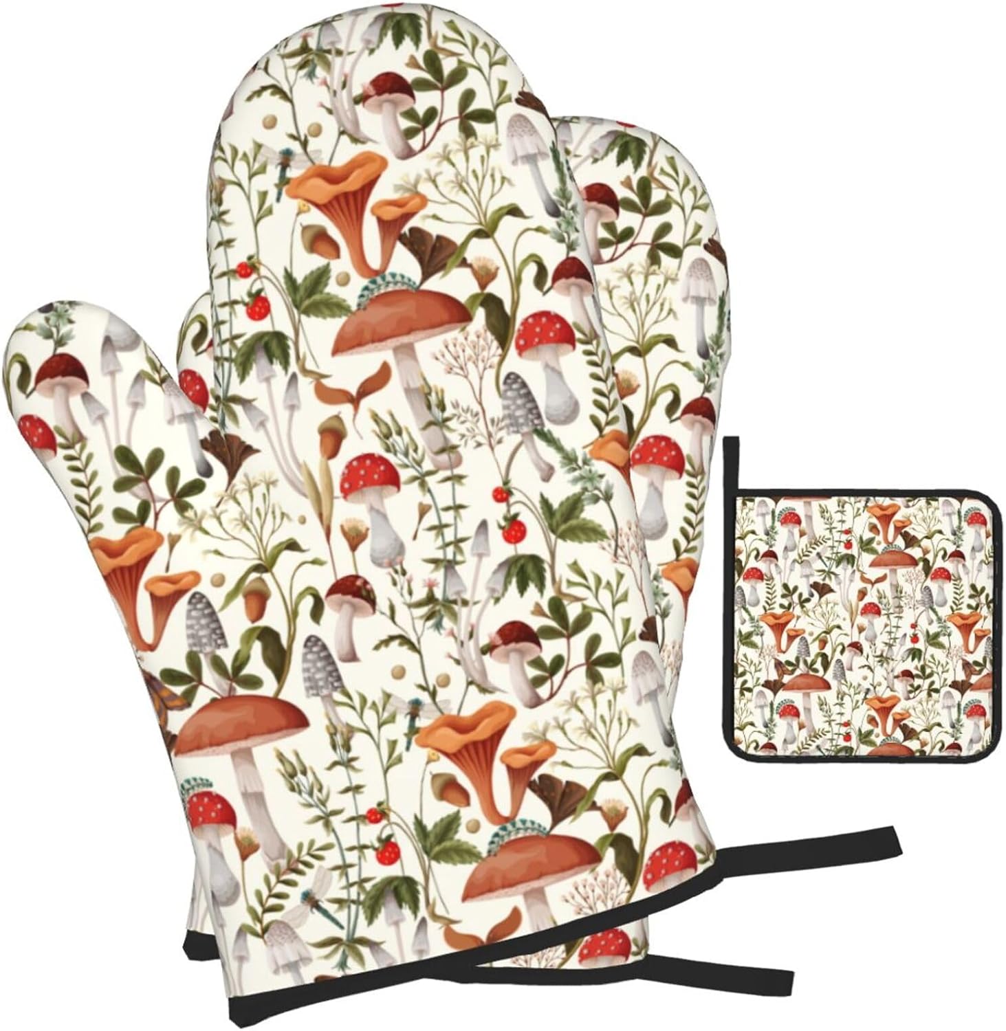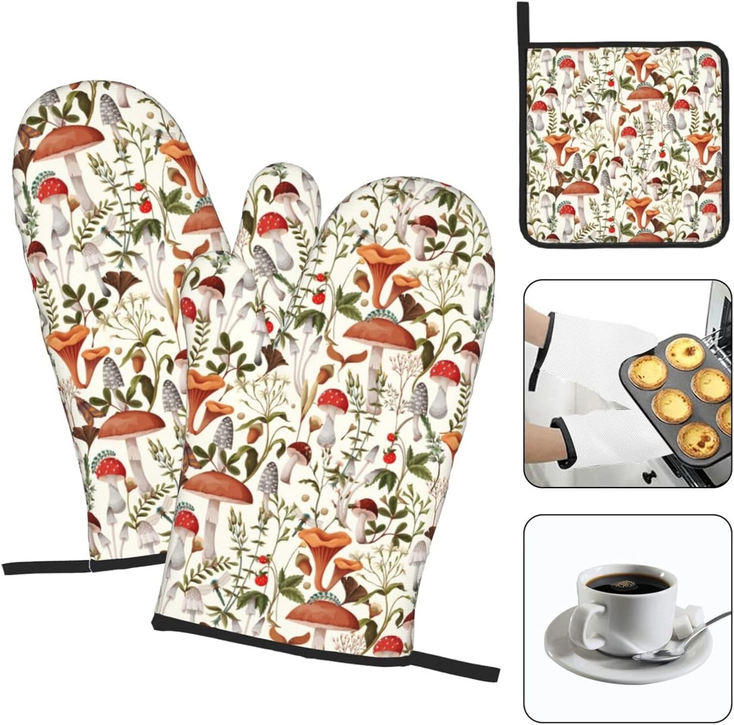 Boho Mushroom Decor Oven Mitts and Pot Holders Sets of 3 Hot Pads Cute Botanic Plant Beige Oven Gloves Heat Resistant Non Slip Washable for Kitchen Cooking Grilling Baking