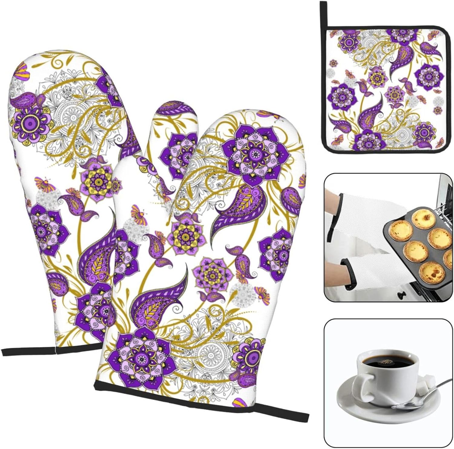 Purple Flower Oven Mitts and Pot Holders Sets of 3 Kitchen Decor Heat Resistant Hot Pads Boho Floral Oven Gloves for Cooking Grilling Baking