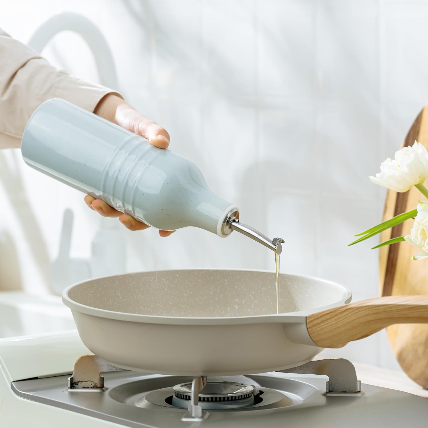- IDEAL CHOICE - Whether you are looking for kitchen decoration or oil dispenser bottle, this oil dispenser is your best choice. It is also a thoughtful choice for birthdays, holidays, anniversaries, or any other occasion. Its simple yet elegant design makes it easy to blend into any modern/farmhouse style or decor, and the clean look is sure to impress