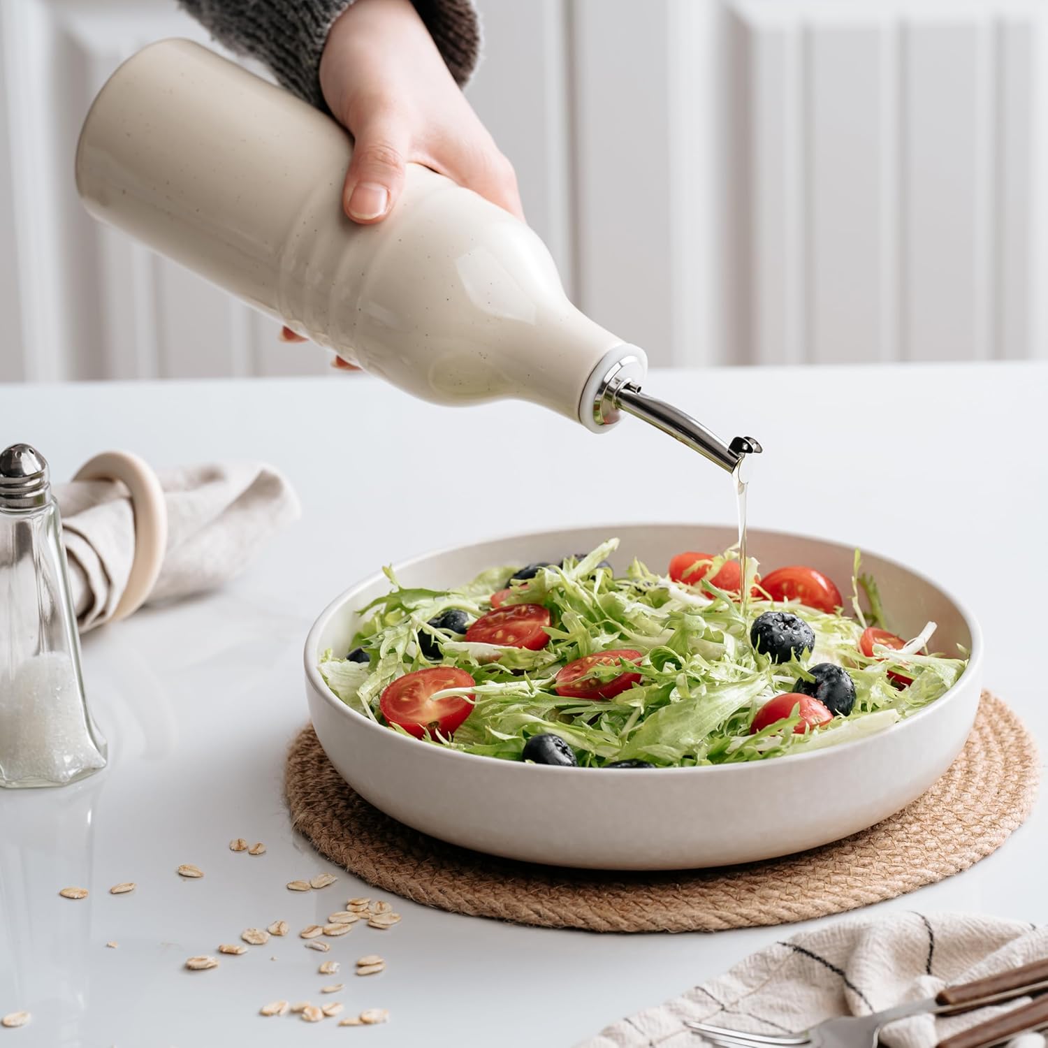 - KEEPS OIL FRESH - Exposure to light can cause olive oil to go rancid. This opaque olive oil dispenser bottle ceramic protects your olive oil or vinegar from harmful UV rays, keeping it fresh longer