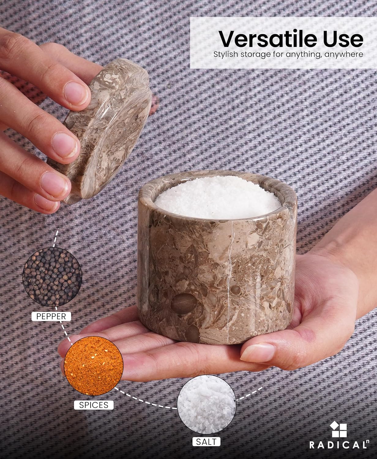 - Durable & Natural Marble Design - Made from 100% natural marble, this salt and spice container offers long-lasting beauty and performance. Each piece has unique veining, making it a one-of-a-kind addition to your kitchen decor.