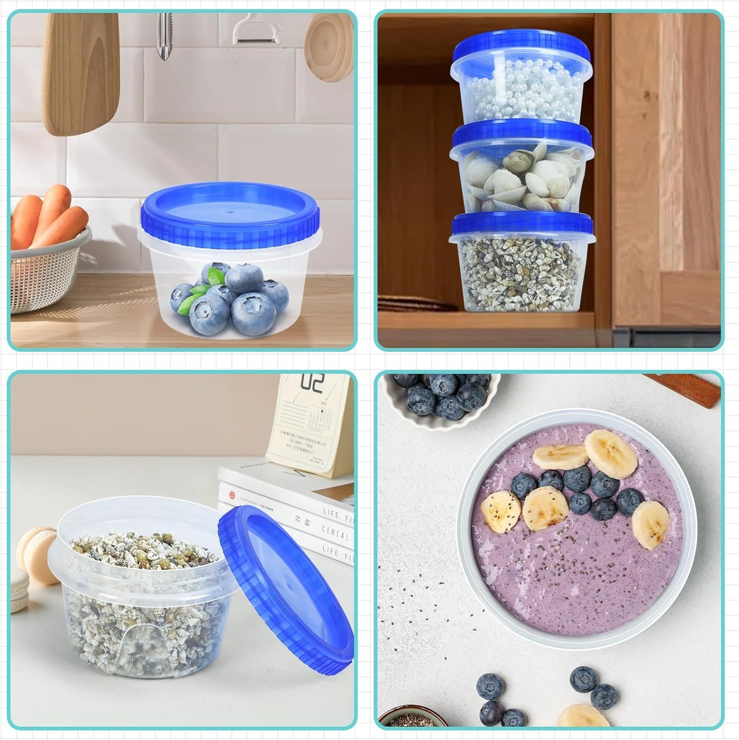 - Package Include: Each package include 12 Pack of Deli Containers with Screw Lids sufficient quantity. Food Containers Clear bottom With blue Top Twist on Lids.