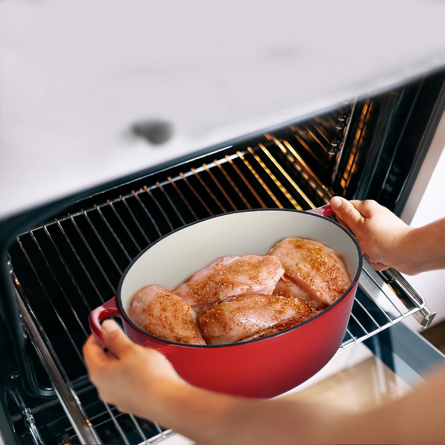 - Versatile Kitchen Essential, the 5 quart Dutch oven capacity serves 4-6 people, from simmering soups to baking bread and making one-pot meals, meets all the needs of daily stewing. It transitions effortlessly from stovetop to oven, making meal prep a breeze, suitable for gas, electric, ceramic, induction stovetops