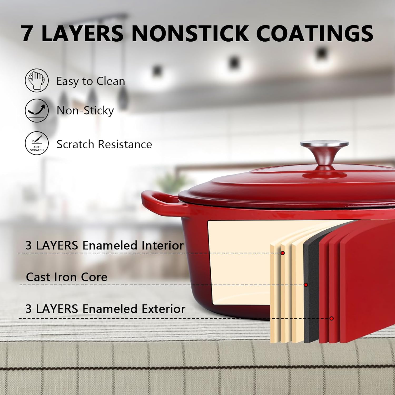 5QT Oval Dutch Oven Pot with Lid, Leonyo 5 Quart Enameled Oval Cast Iron Dutch Oven for Sourdough Bread Breaking, Heavy Duty Cookware for Braising, Stews, Roasting, Red