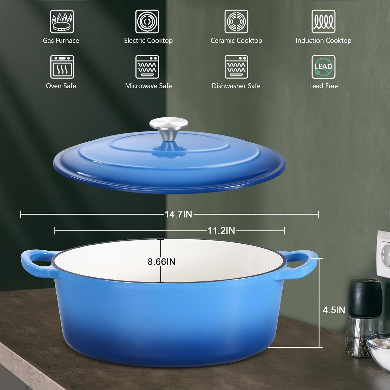 5QT Oval Dutch Oven Pot with Lid, Leonyo 5 Quart Enameled Oval Cast Iron Dutch Oven for Sourdough Bread Breaking, Heavy Duty Cookware for Braising, Stews, Roasting, Blue