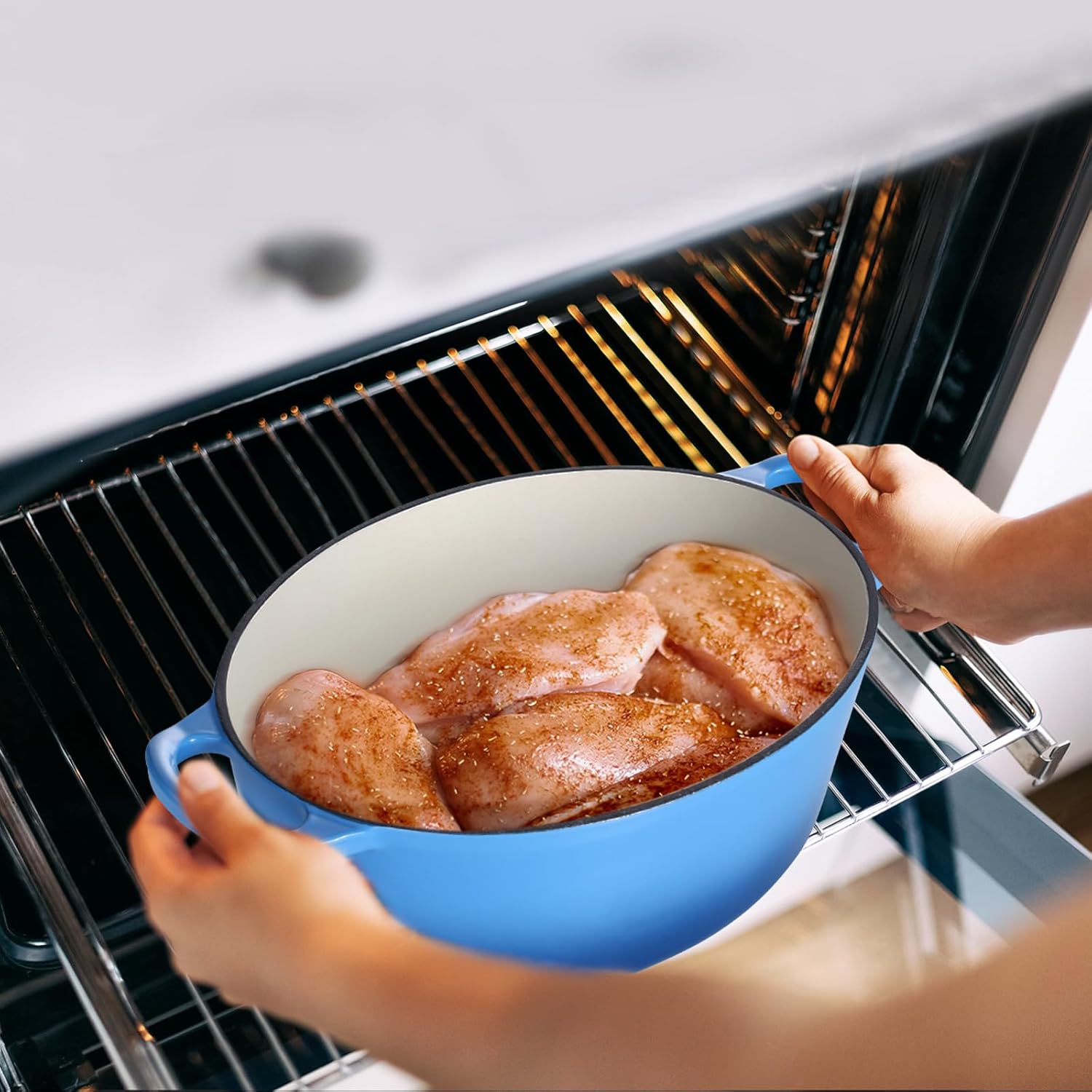 - Superior Heat Retention, our Dutch oven for bread baking ensure even heat distribution and retention, evenly heating throughout both the bottom and sidewalls, oval Dutch oven also reduces the amount of energy needed for cooking, ensuring perfect roasts, stews and baked bread every time. Oven Safe up to 500℉