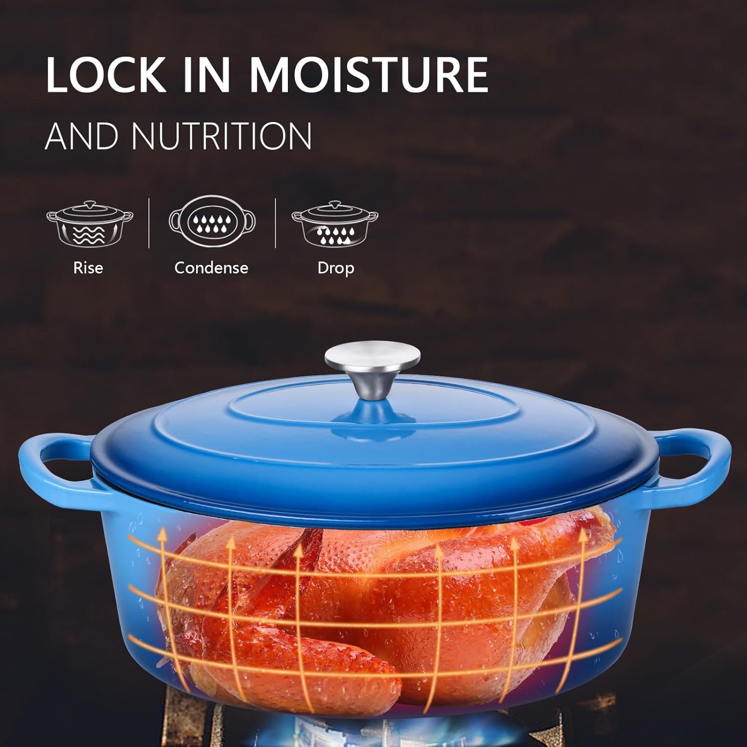 - Moisture-Rich Cooking, this enameled cast iron Dutch oven is design with circulating shower type lid, the raised design of the pot cover allows the water vapor circulates and locks inside the Dutch oven, fully releasing the flavor and nutrients of the ingredients, possess pretty heat retention performance