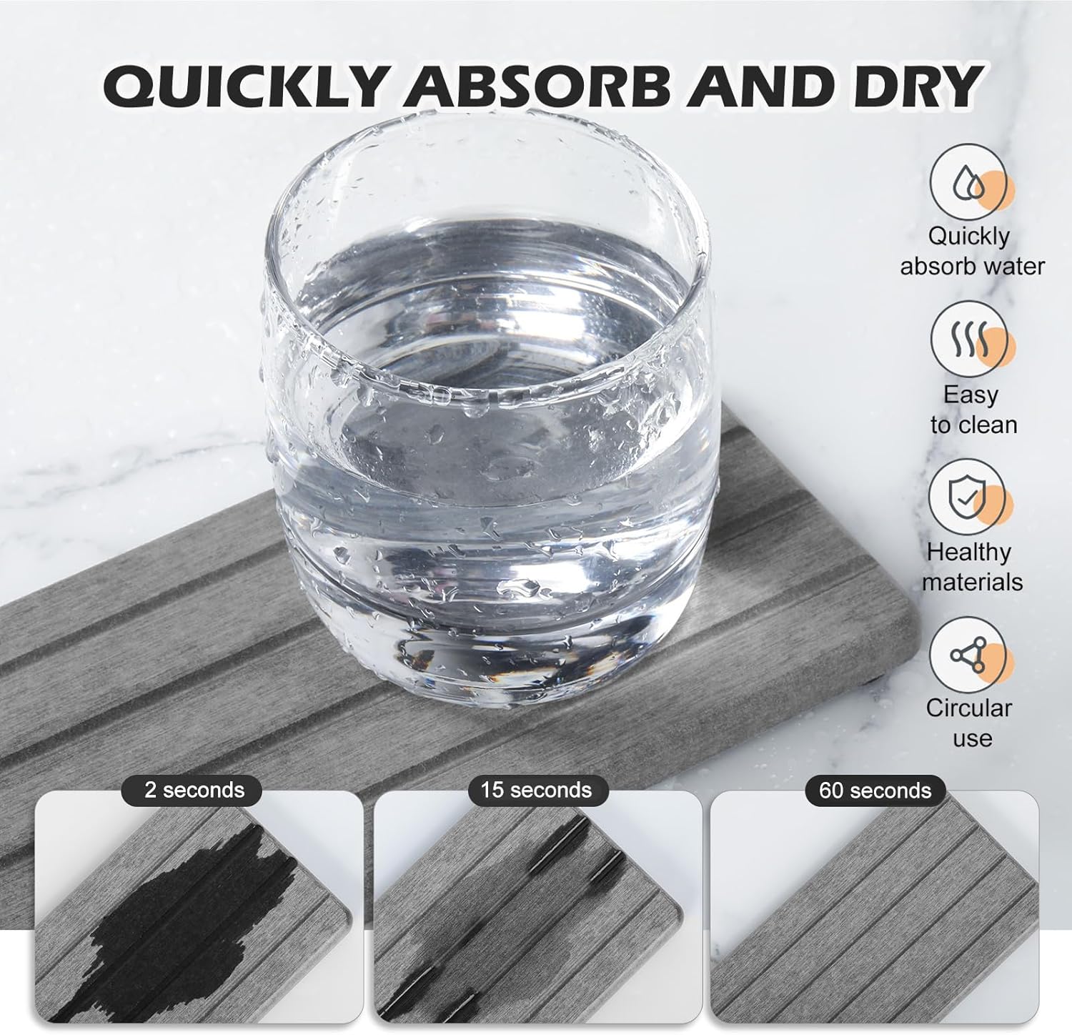 - Quick Water Absorption and Fast Drying --- Our fast drying stone sink tray is made from natural diatom mud and plant fibers,the small pores in diatomaceous earth give it amazing water absorption.They can absorb water and dry out in a few minutes.This water absorbing stone makes the bathroom countertop more dry and tidy.