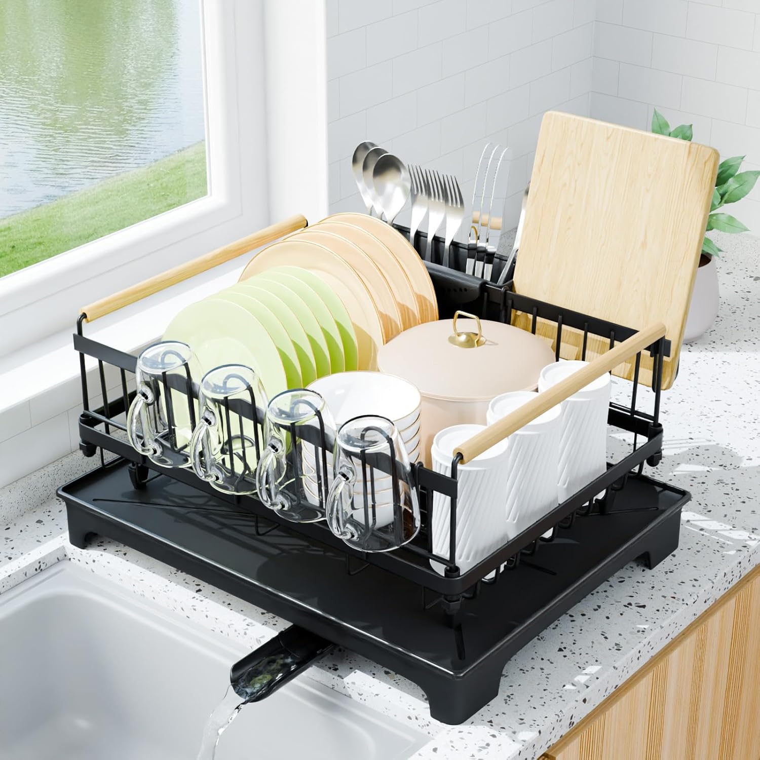 Dish Drying Rack, Drying Rack with Automatic Drainboard, Dish Racks for Kitchen Counter, Rustproof Dish Drainer with Removable Utensil Holder, Cups Holder,Black