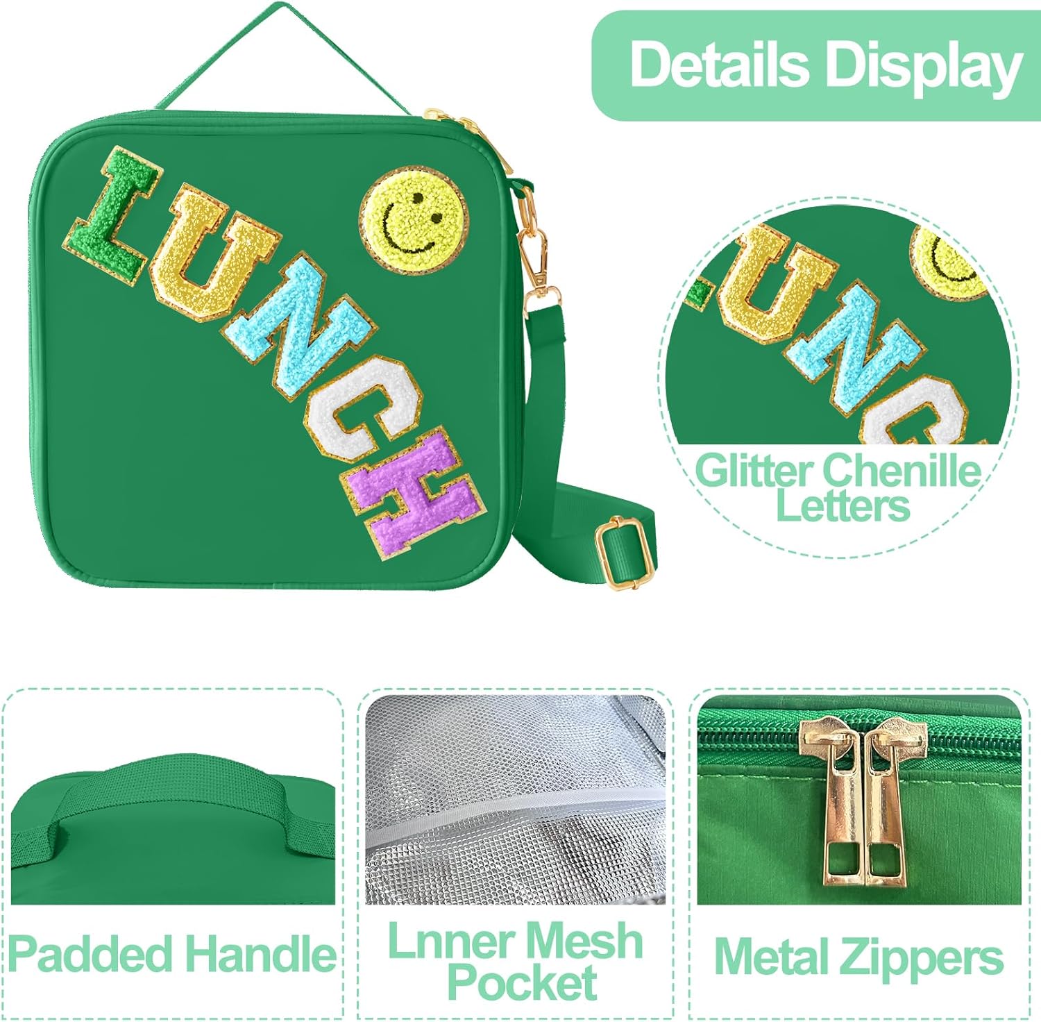 Insulated Lunch Bag With Adjustable Shoulder Strap, Nylon Preppy Lunch Box Large Insulated Lunch Bag Reusable Lunch Tote Bag with Smiley Preppy LunchBag for Girls School Travel Picnic (Dark green)