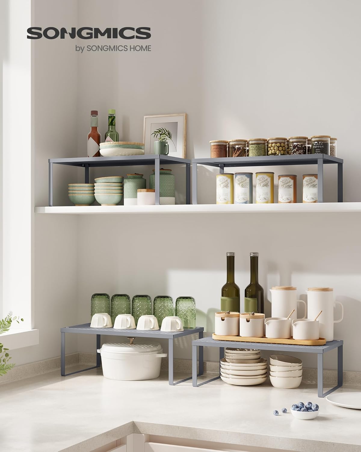 SONGMICS Spice Racks, Set of 2 Metal Cabinet Shelf Organizers, Countertop Organizers, Shelf Risers, Stackable, Expandable, Silver UKCS401G01