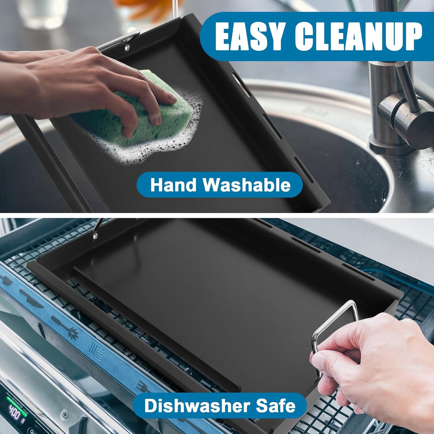 - Easy to Clean: The flat top grill has a non-stick coating on the surface, which greatly reduces food sticking to the grill, ensures even cooking and prevents burning. And easy to clean, saving time and effort, it retains its shine after cleaning and is hand washable or dishwasher safe